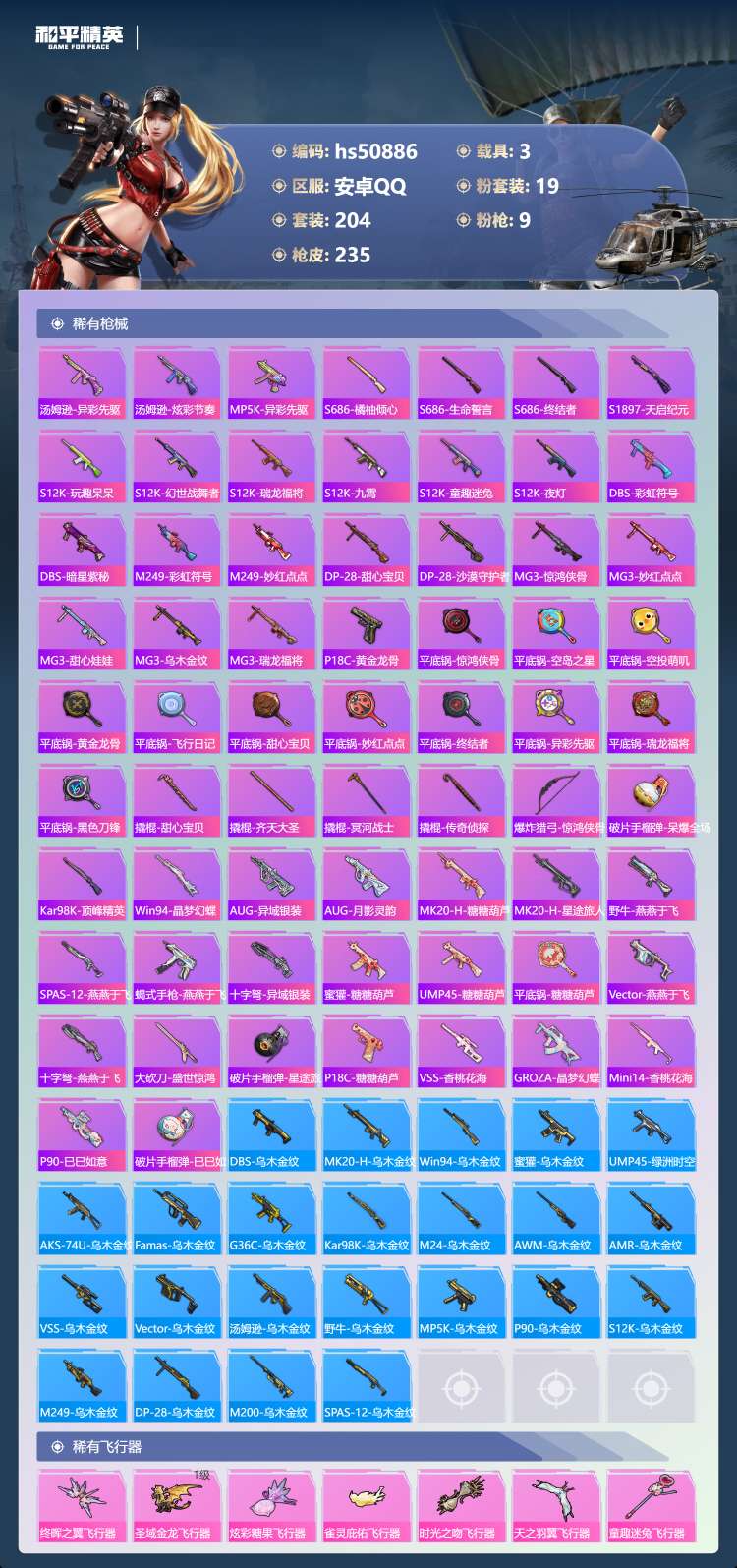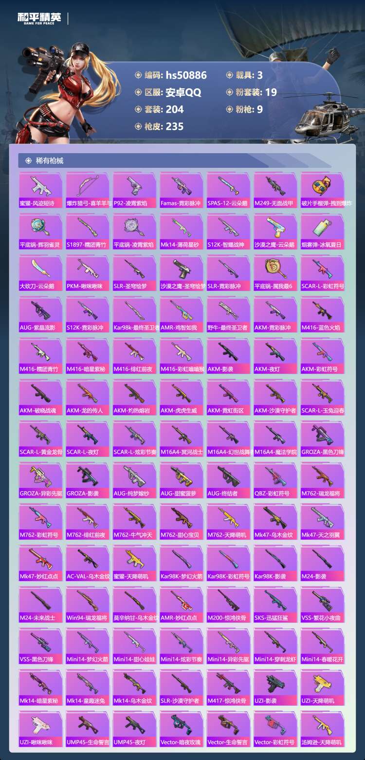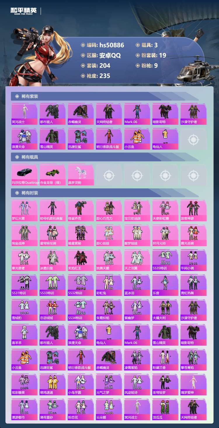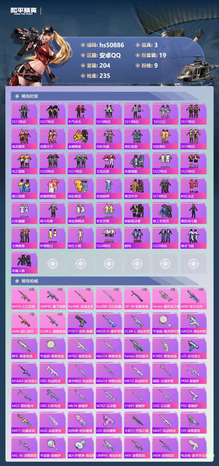 hs50886 安卓手Q-19王牌印记-19粉装-9特效枪-3载具-86548热力值-204套装-2