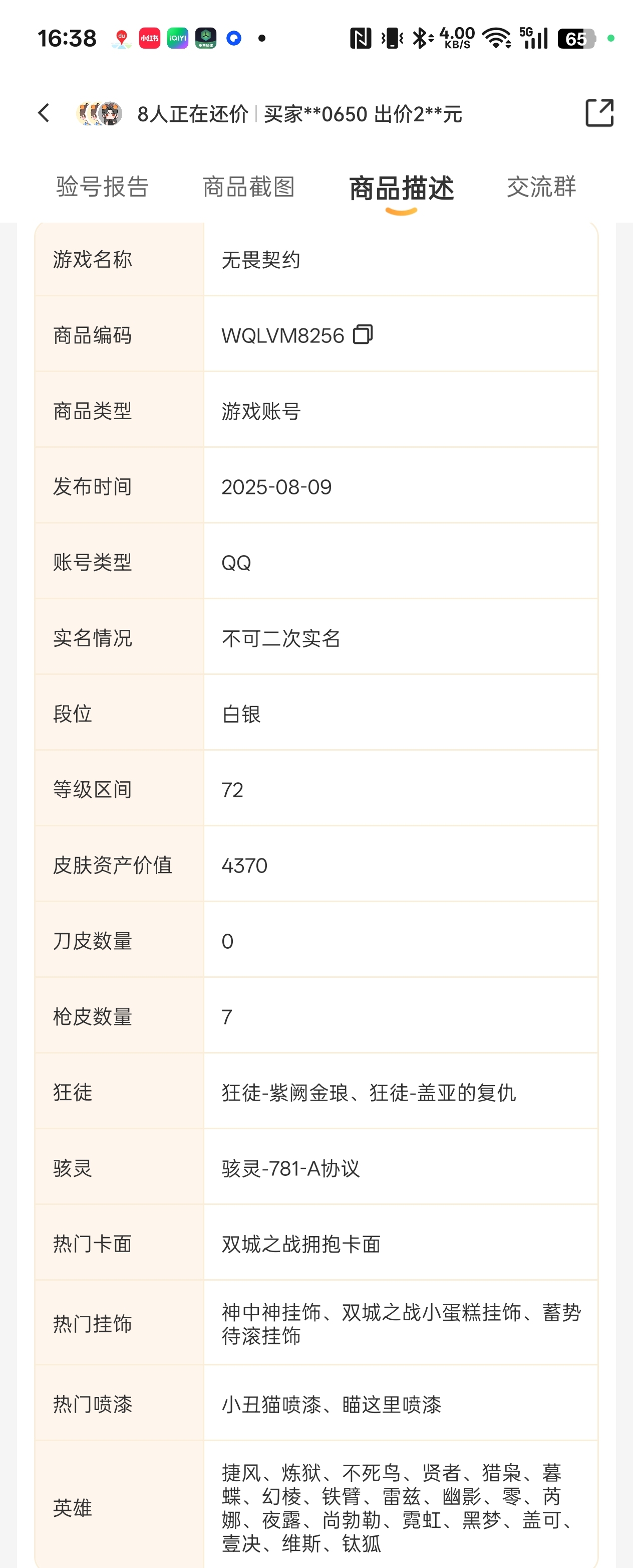 通过App,与卖家商议价格及保险,并向卖家索要账号最新截图,确认后下单购买。