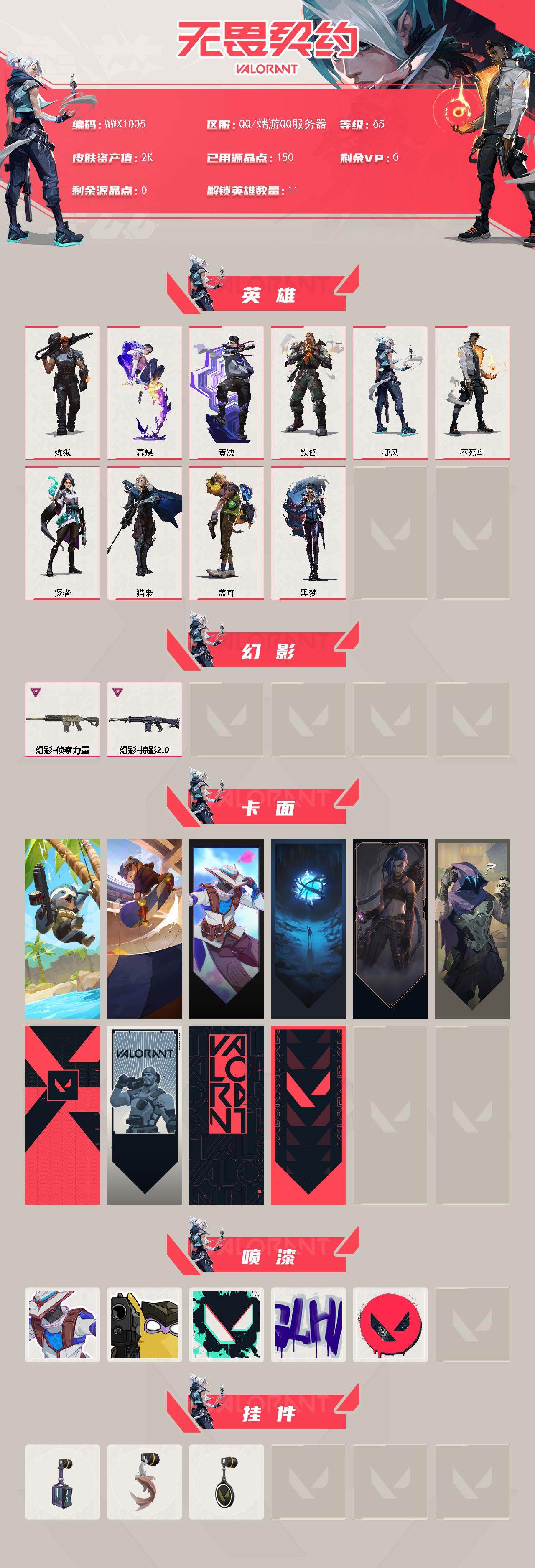 【WWX1005】卓越*2/皮肤*4/等级*65/段位:白银/炼狱/暮蝶/壹决/铁臂/捷风/不死鸟/贤者/猎枭/盖可/黑梦/幻影-侦察力量/幻影-掠影//2.0/树懒大作战 卡面/Clutch 卡面/无畏契约GO!第一卷:零 卡面/无垠星环 卡面/《双城之战》金克丝 卡面/黑影先生的咖啡! 卡面/代号红色 卡面/新兵报到 卡面/V契约 卡面/无畏契约 卡面/无畏契约GO!第一卷:零 喷漆/放下武器 喷漆/胜利属于无畏契约 喷漆/GLHF 喷漆/无畏契约 喷漆/动力机箱 挂饰/红鳞松叶 挂饰/无畏