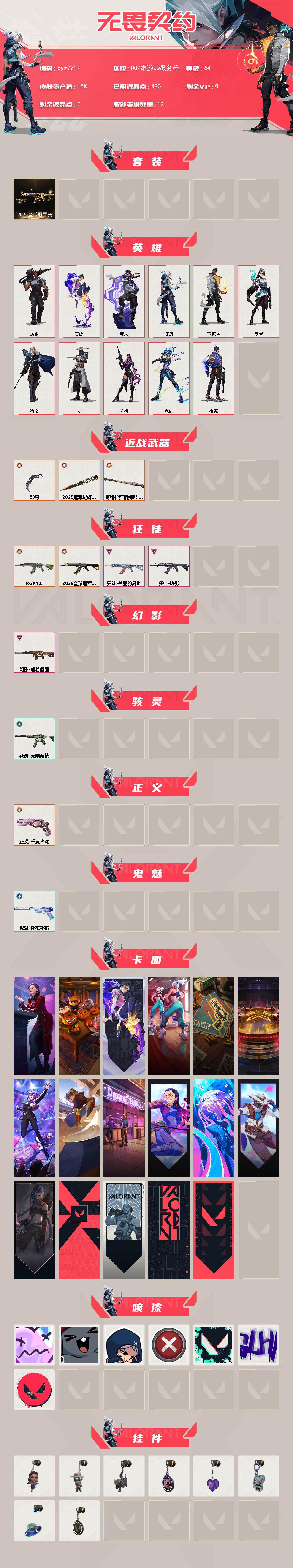 铂金号多热门 25冠军套 速出 qyz7717 近战武器皮肤: 影钩 步枪皮肤: 狂徒-盖亚的复仇,幻影-般若假面,狂徒-掠影,狂徒-RGX 11z pro 佩枪皮肤: 正义-千灵华绽 亮点: 【qyz7717】【套装】:2025全球冠军赛套装【英雄】:炼狱,暮蝶,壹决,捷风,不死鸟,贤者,猎枭,零,芮娜,霓虹,夜露【近战 武器】:近战武器-2025全球冠军赛 蝴蝶刀,近战武器-影钩,近战武器-阿特拉斯指挥部 甩棍【狂徒】:狂徒-2025全球冠军赛,狂徒-RGX 11z Pro,狂徒-掠影,狂徒
