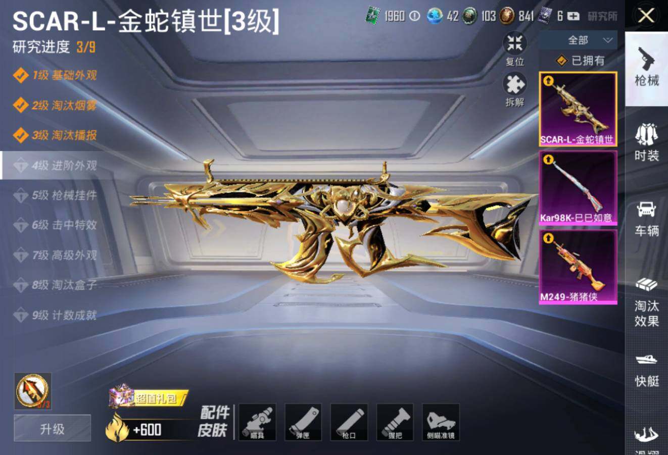 【特效枪等级】:SCAR-L-金蛇镇世(三级),Kar98K-巳巳如意(五级),M249-猪猪侠(七级)