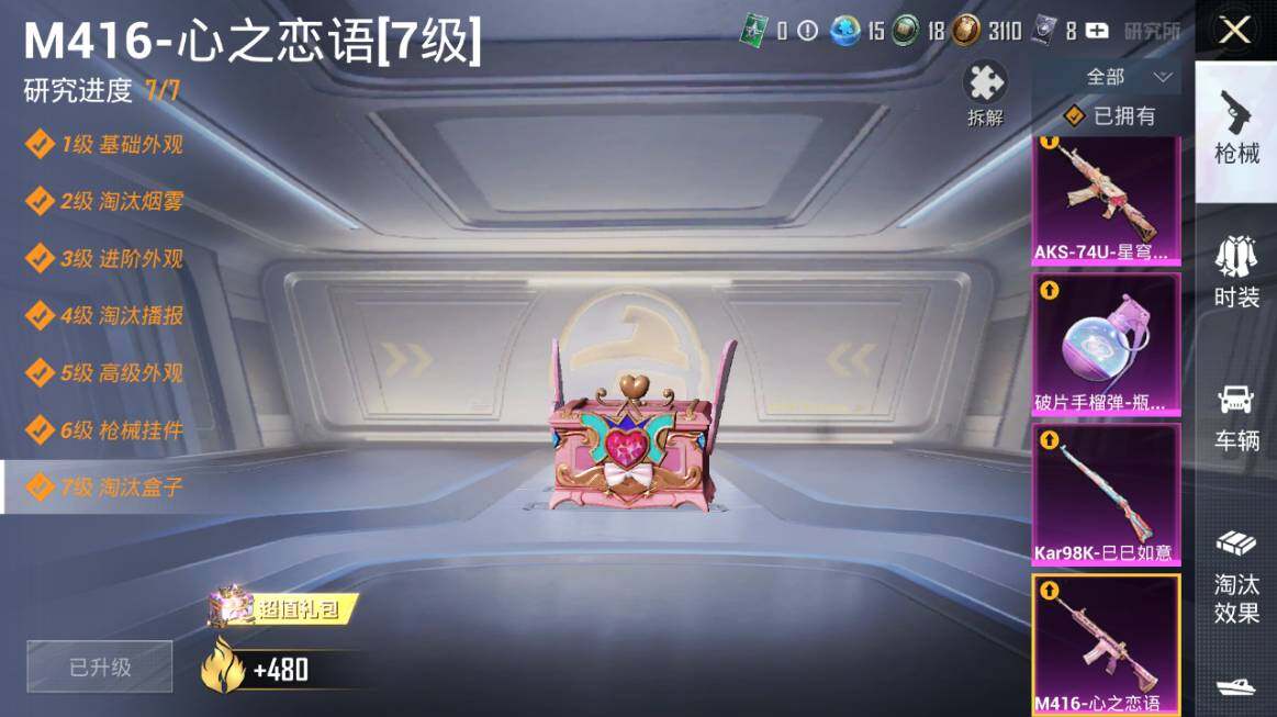 【粉色枪皮等级】:M416-心之恋语(七级),AKS-74U-星穹咏叹调(五级),Kar98K-巳巳如意(五级),Mk14-甜梦熊击(五级),DP-28-豹影疾电(五级),烟雾弹-甜梦