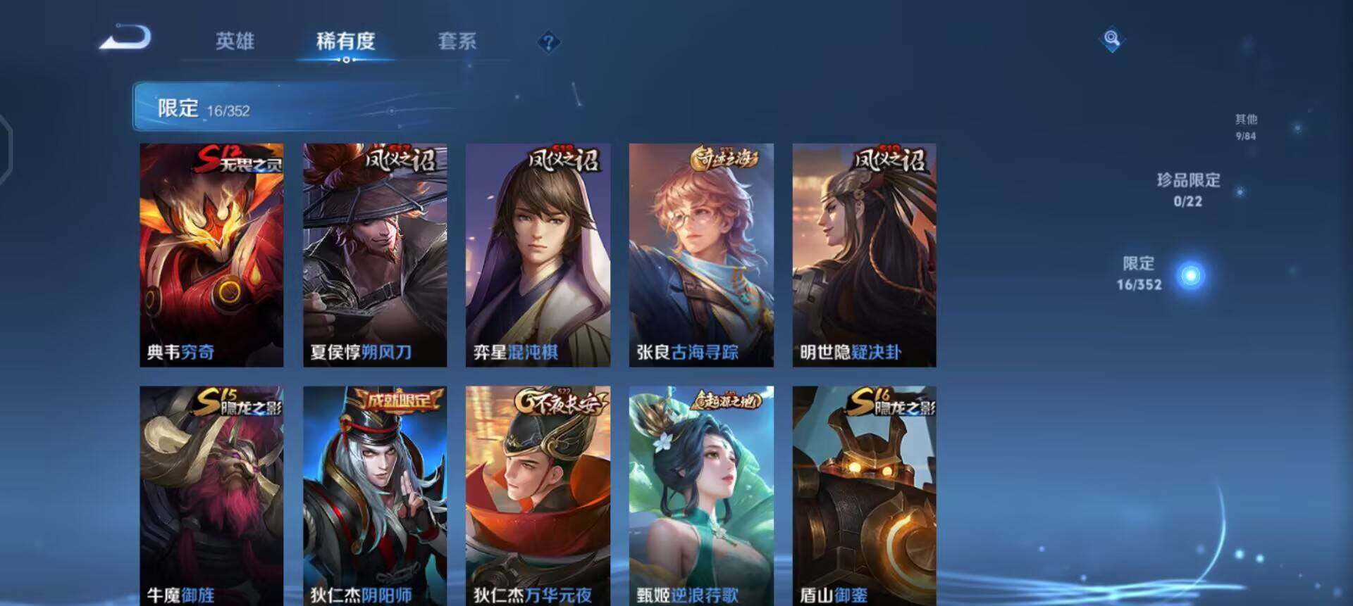 【限定皮肤】:狄仁杰阴阳师,夏侯惇朔风刀,典韦穷奇,狄仁杰万华元夜,老夫子醍醐杖,牛魔御旌,鬼谷子原初探秘者,弈星混