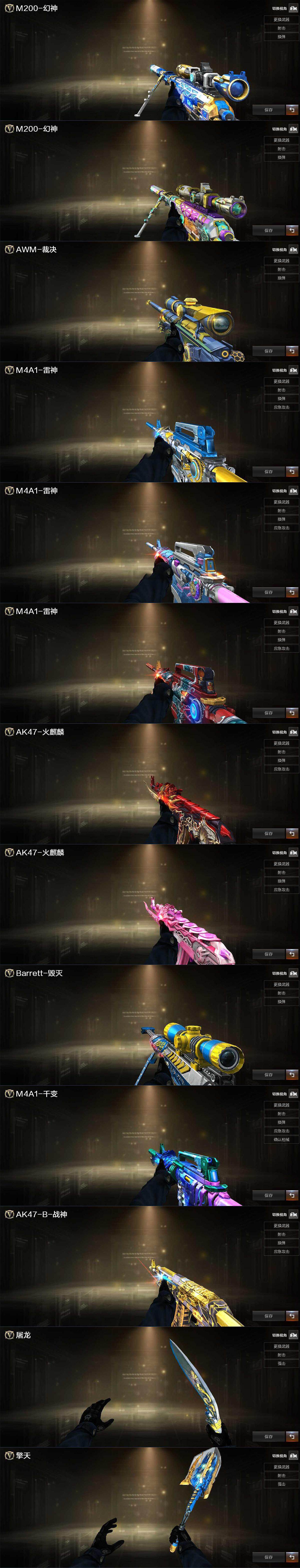 【皮肤】:幻神-冠军之幻,幻神-巅峰荣耀,裁决-运输船 皮肤,雷神-荣耀之魄,雷神-宇航兔皮肤,M4A1-雷神-新春神龙皮肤,火麒