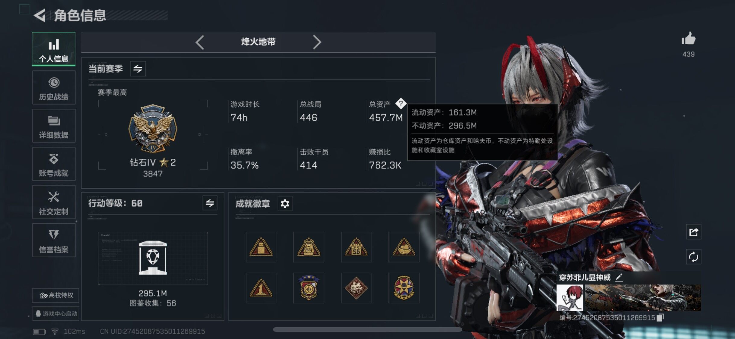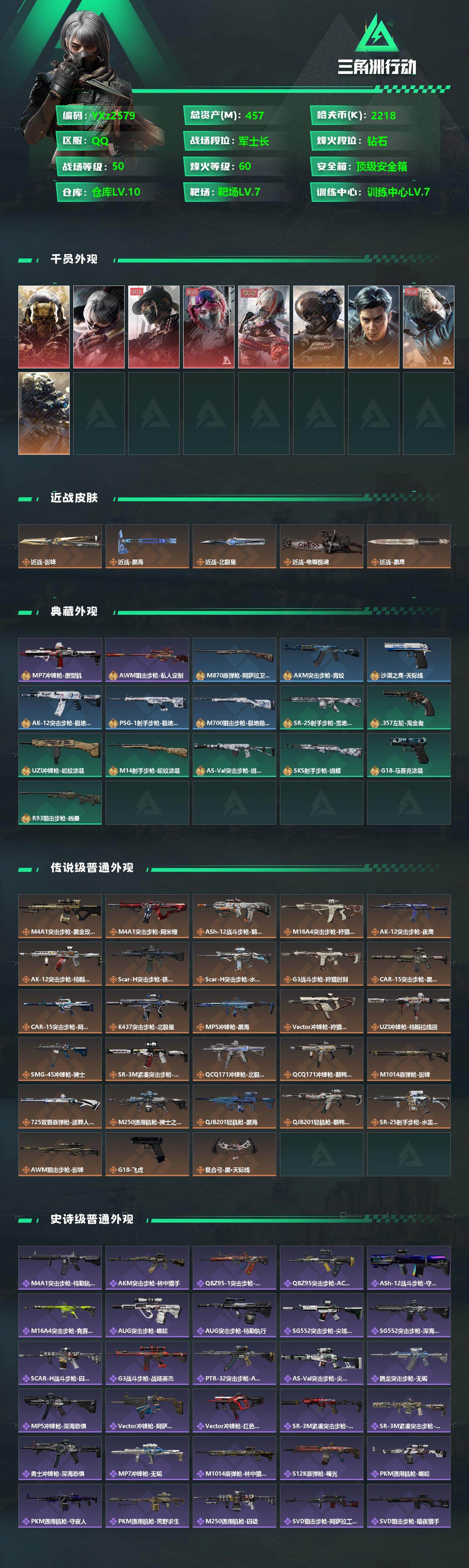 【高氪金土豪号:满红皮+四刀皮+飞虎/高额资产457M】【蚀金玫瑰+水墨云图+黑天际线+天使午夜邮差+维什戴尔+北极星+黑海+影锋+电锯惊魂-性价比高强烈推荐】【Q区三端互通】【无二次】YXz2579-特勤处:仓库10级/训练中心7级/靶场7级-总资产457m-哈夫币221w-烽火等级:60级
