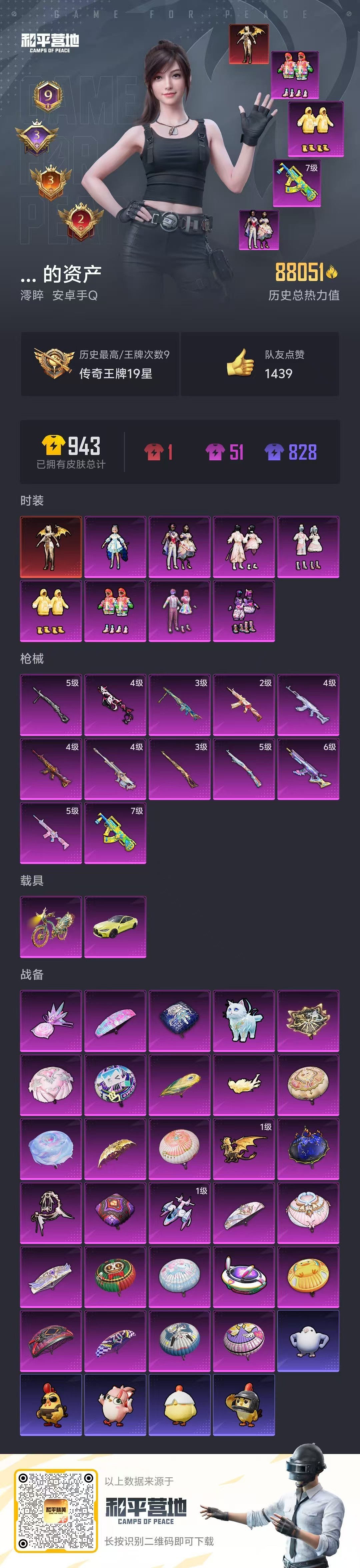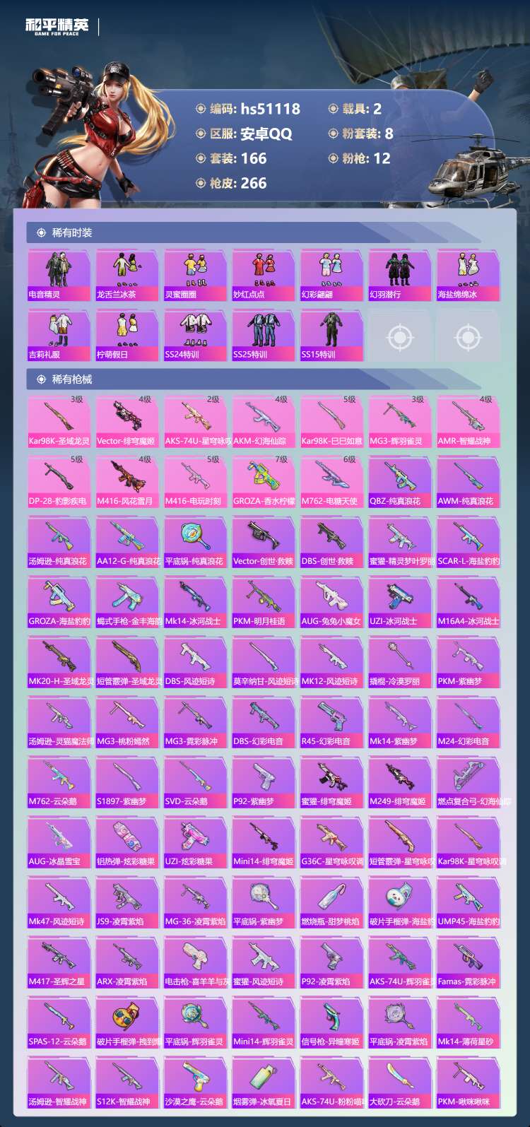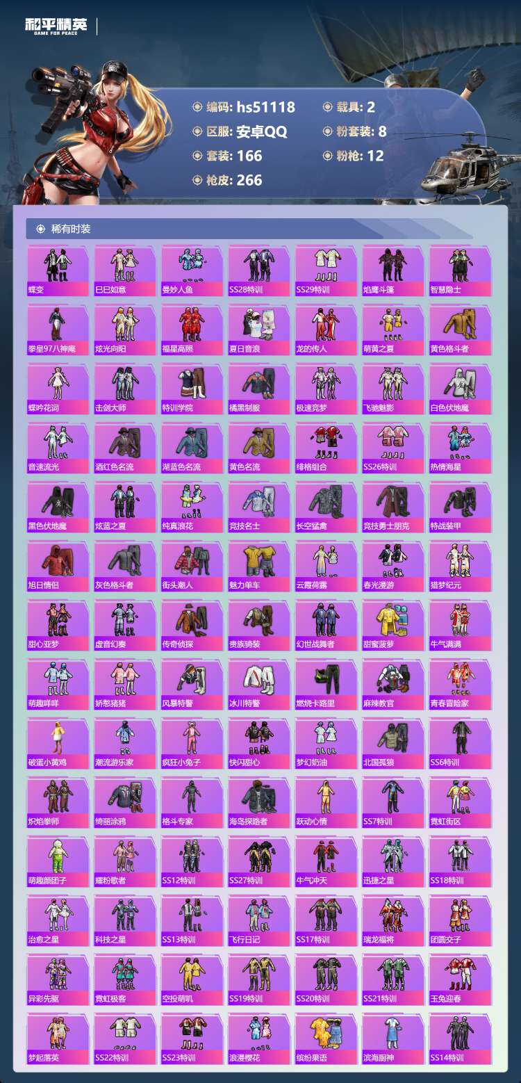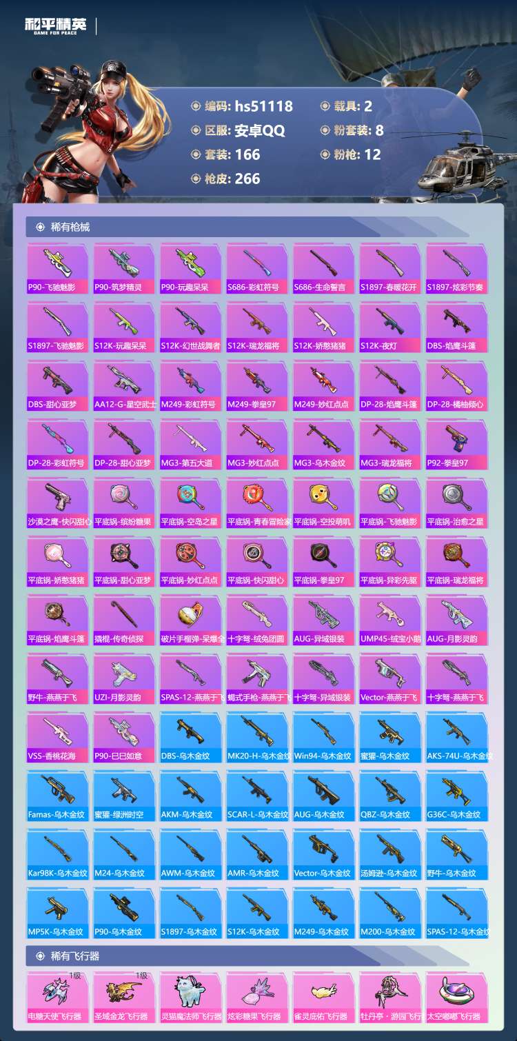 hs51118 安卓手Q-9王牌印记-1红装-8粉装-12特效枪-2载具-88051热力值-166套