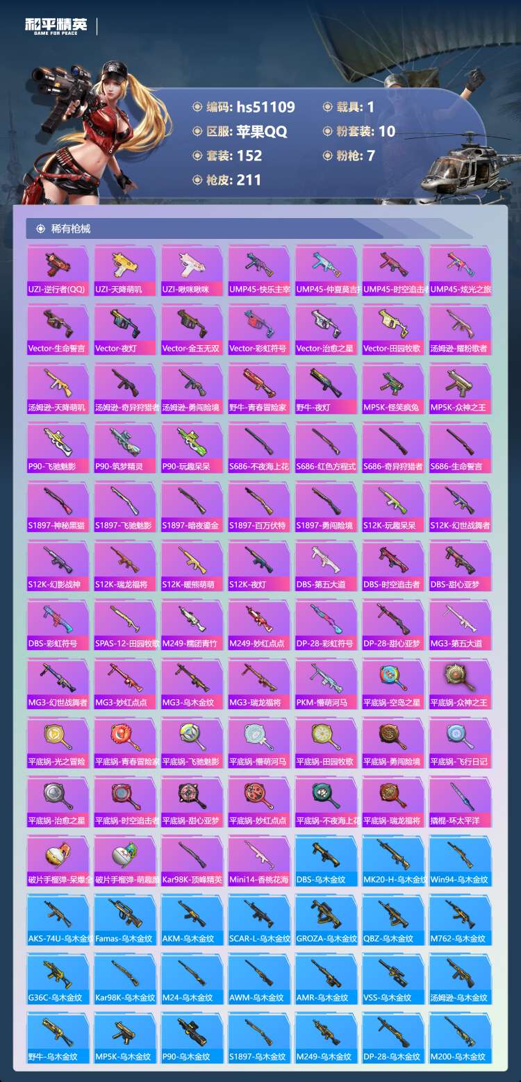 苹果手Q-10王牌印记-有战神框-10粉装-7特效枪-1载具-68641热力值-152套装-211枪