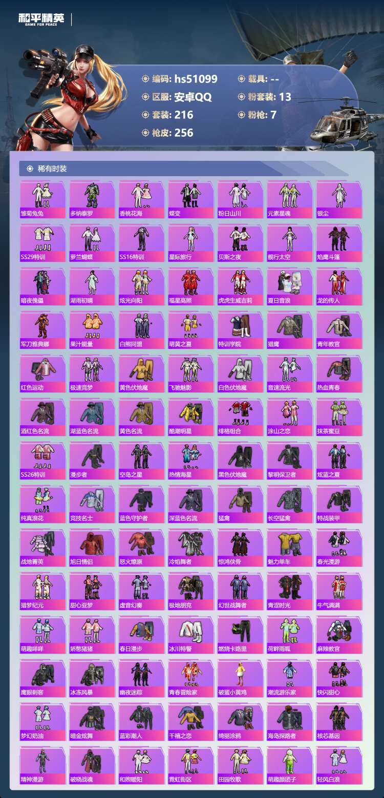 hs51099 安卓手Q-21王牌印记-有战神框-13粉装-7特效枪-88974热力值-216套装-