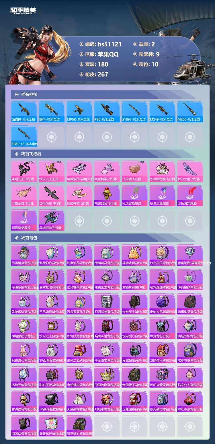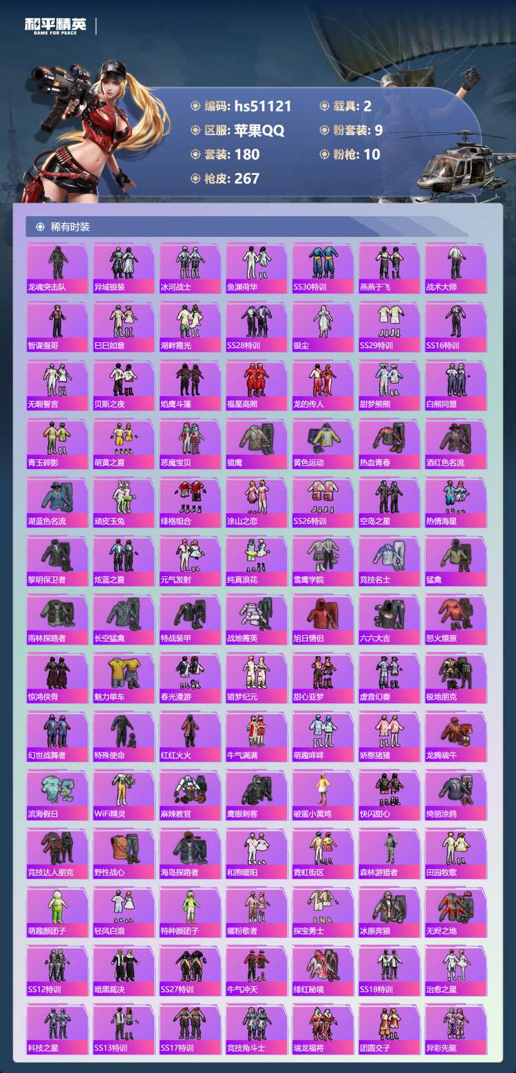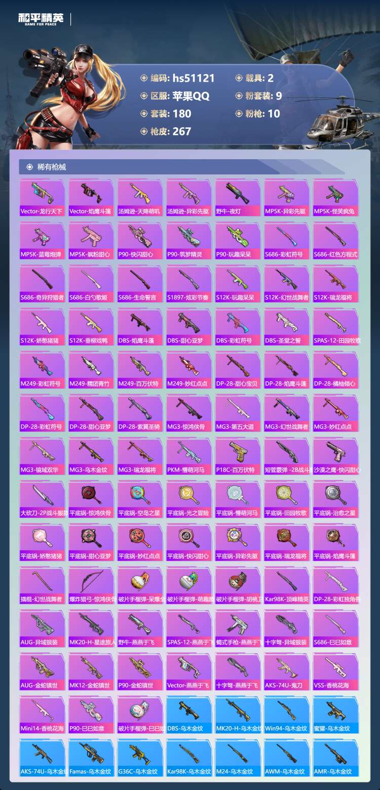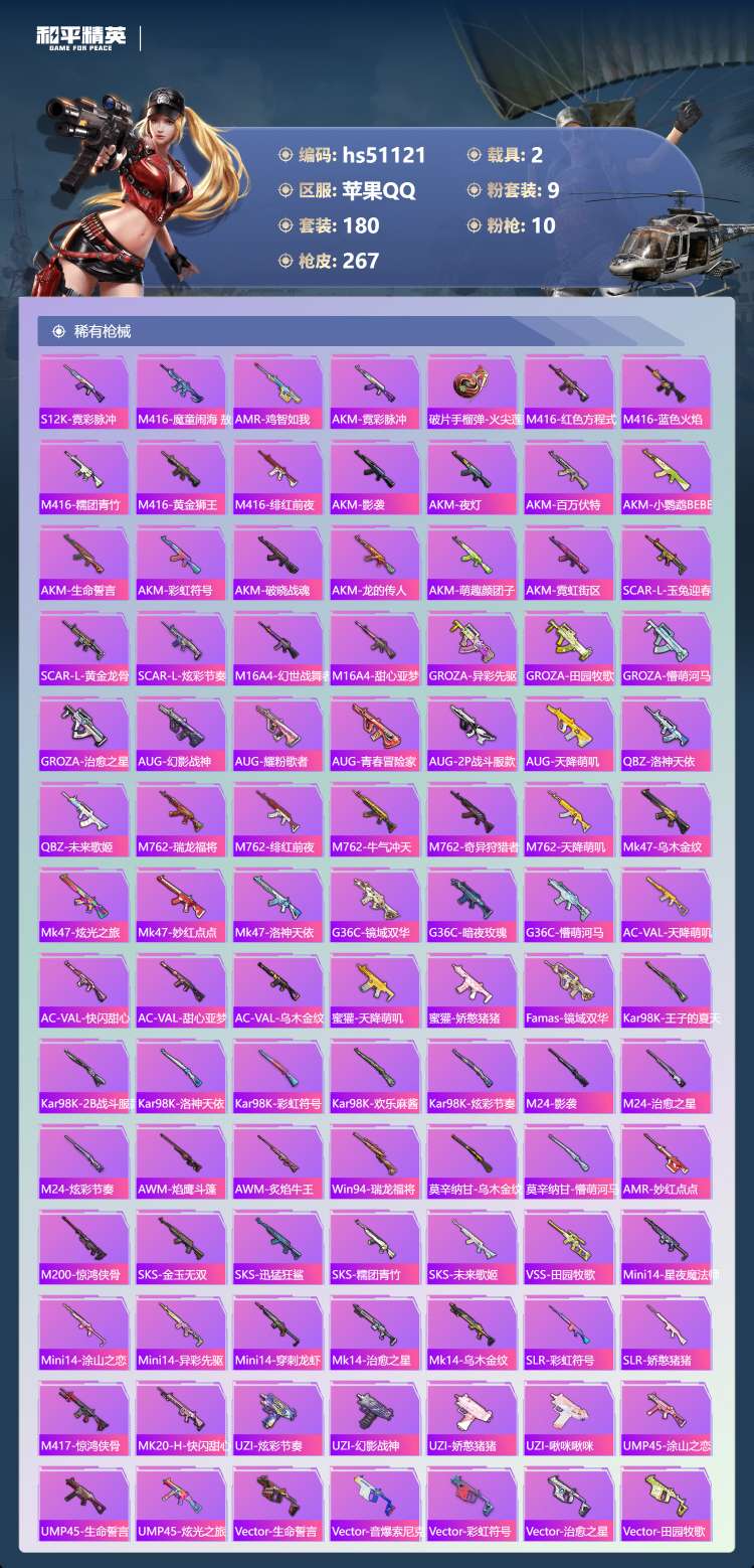 hs51121 苹果手Q-17王牌印记-1红装-9粉装-10特效枪-2载具-93028热力值-180