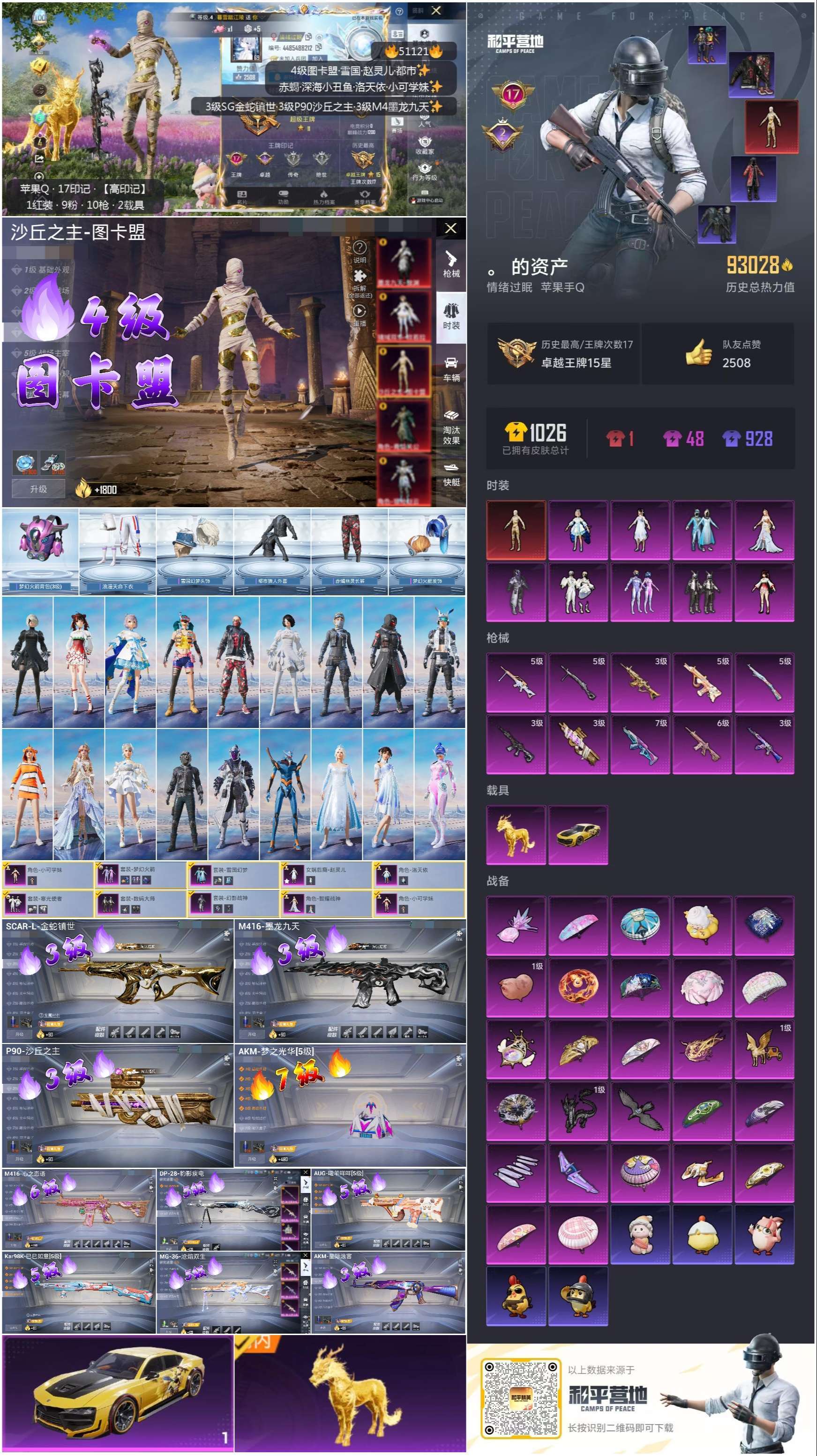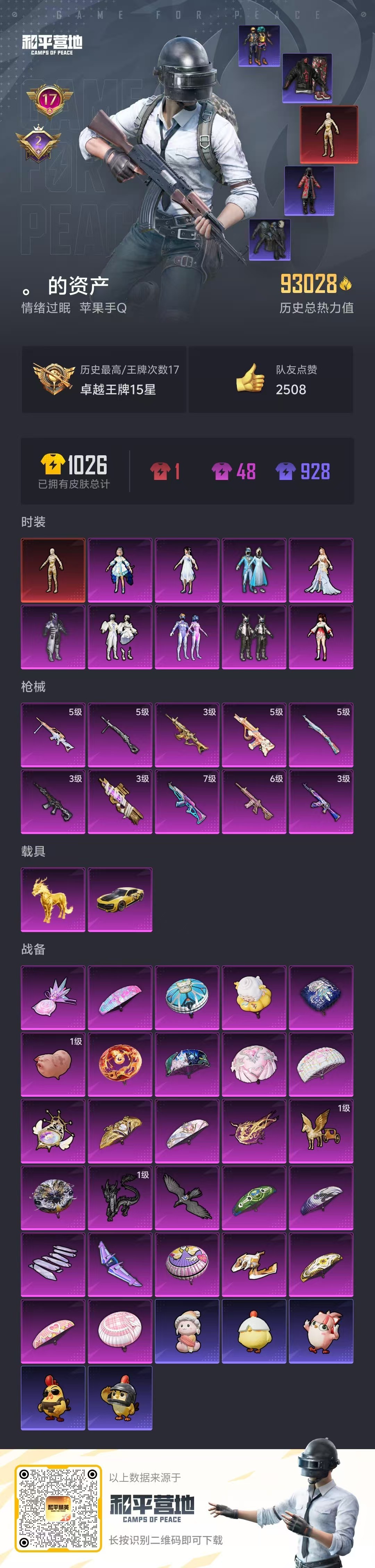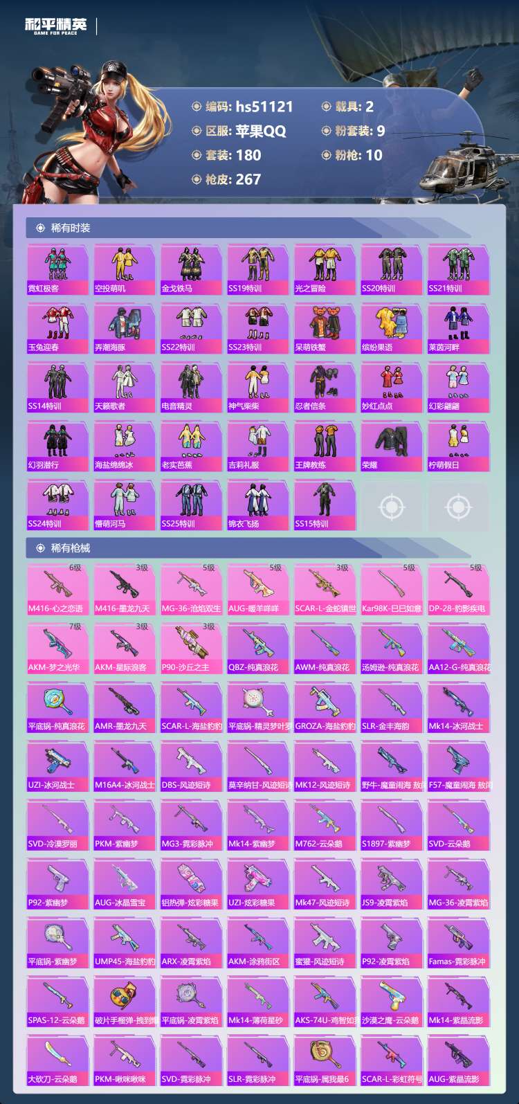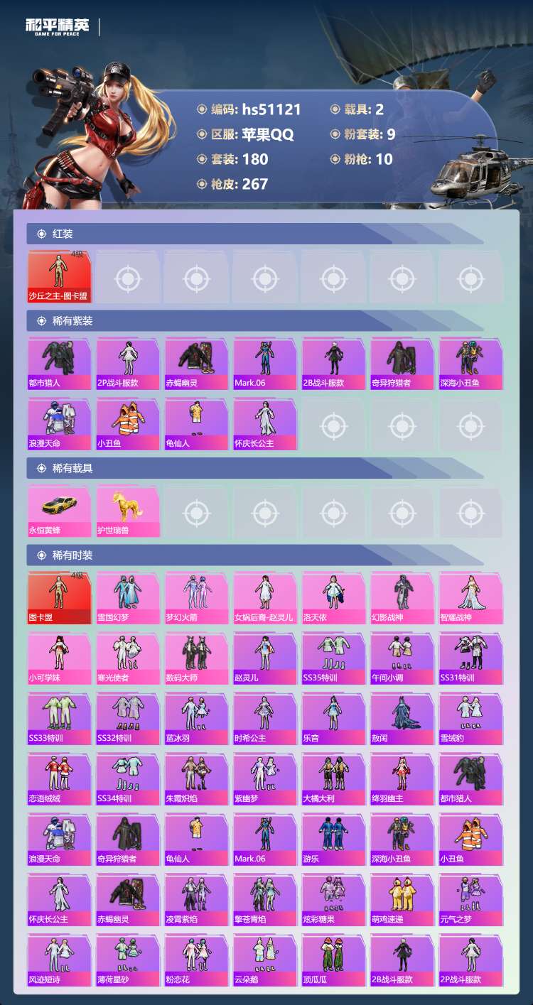 hs51121 苹果手Q-17王牌印记-1红装-9粉装-10特效枪-2载具-93028热力值-180