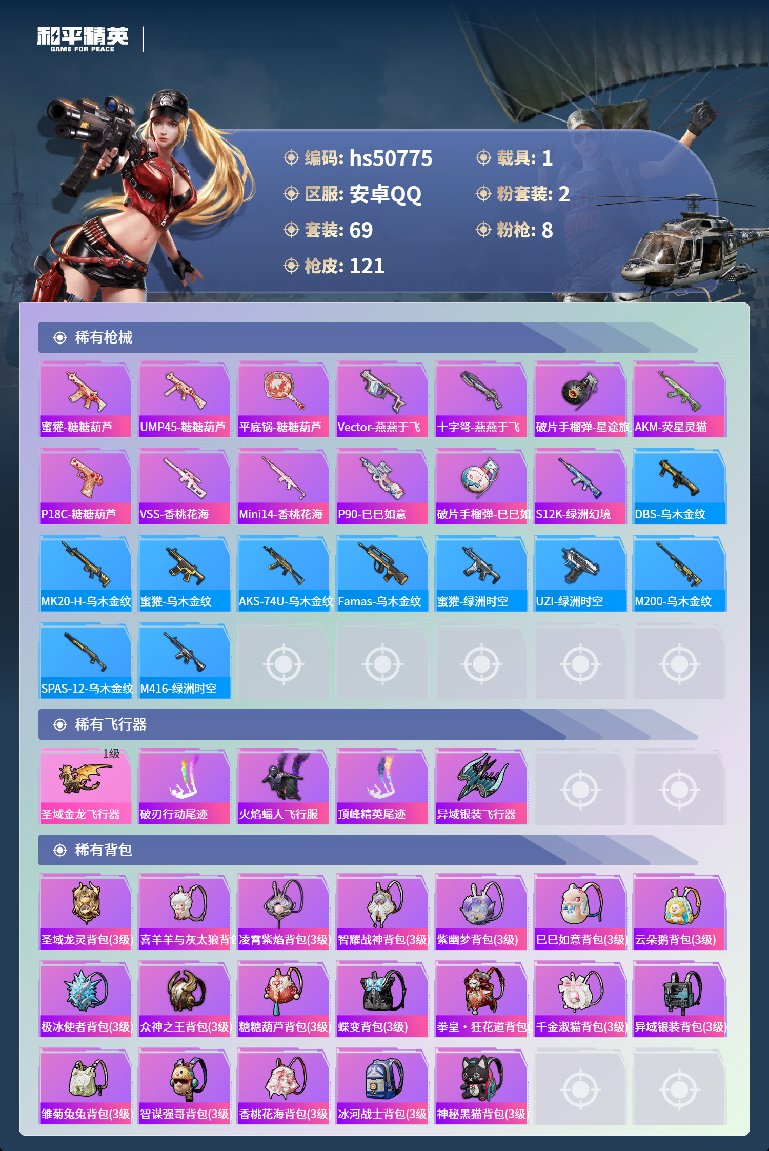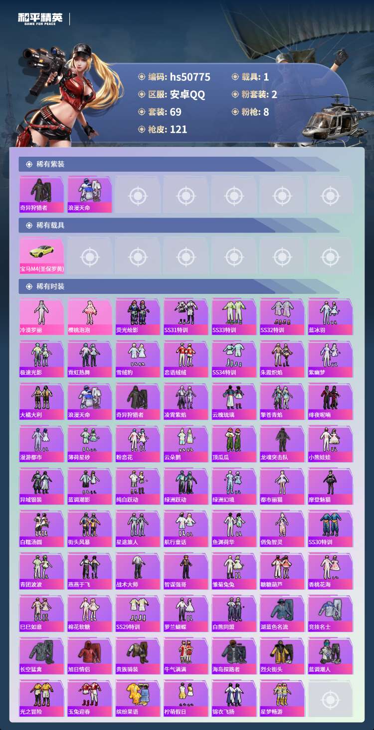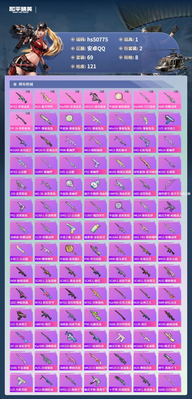hs50775 安卓手Q-6王牌印记-2粉装-8特效枪-1载具-37289热力值-69套装-121枪