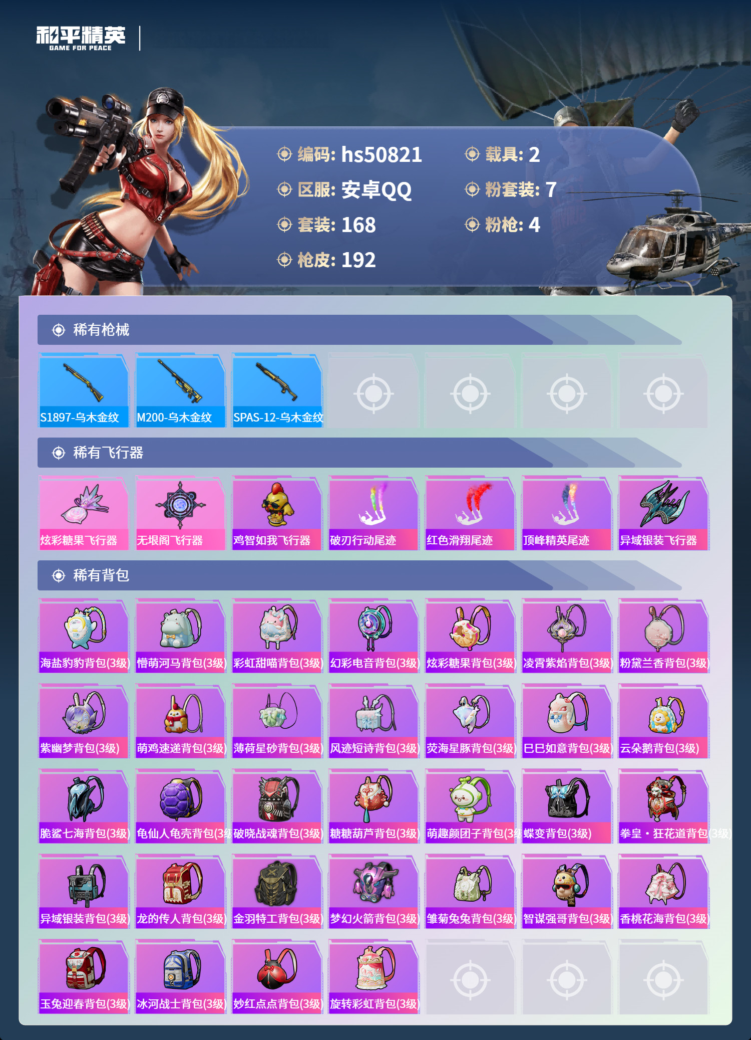 hs50821 安卓手Q-12王牌印记-7粉装-4特效枪-2载具-58341热力值-168套装-19