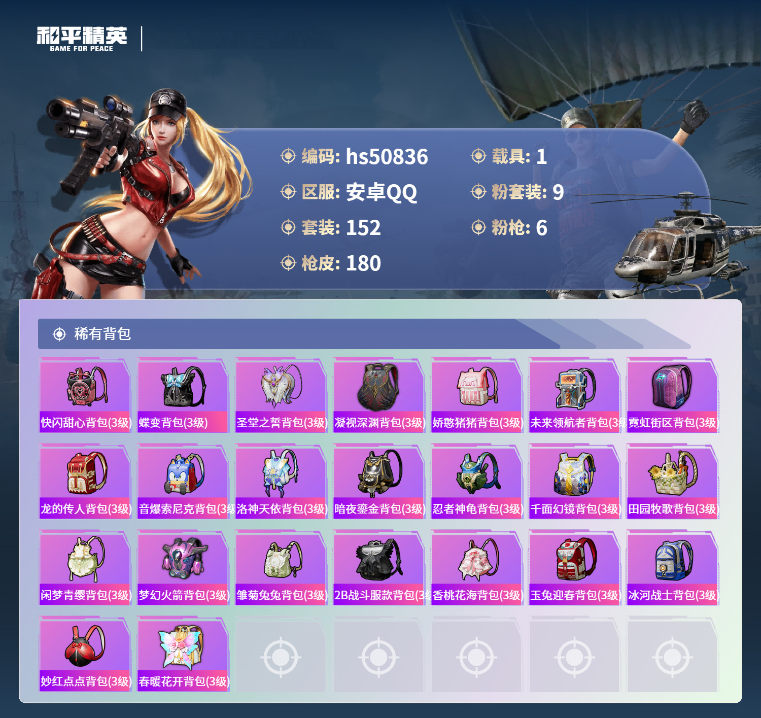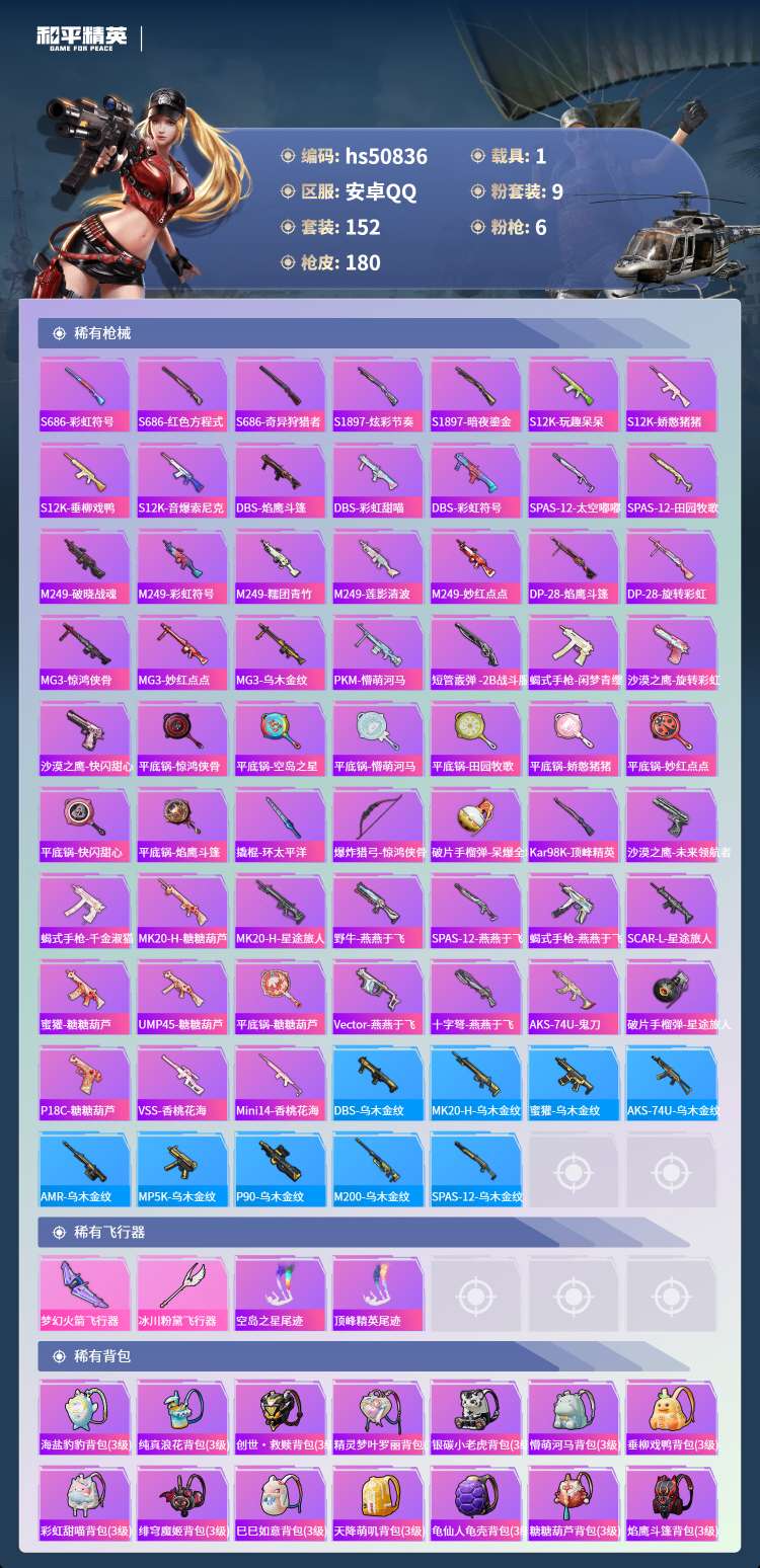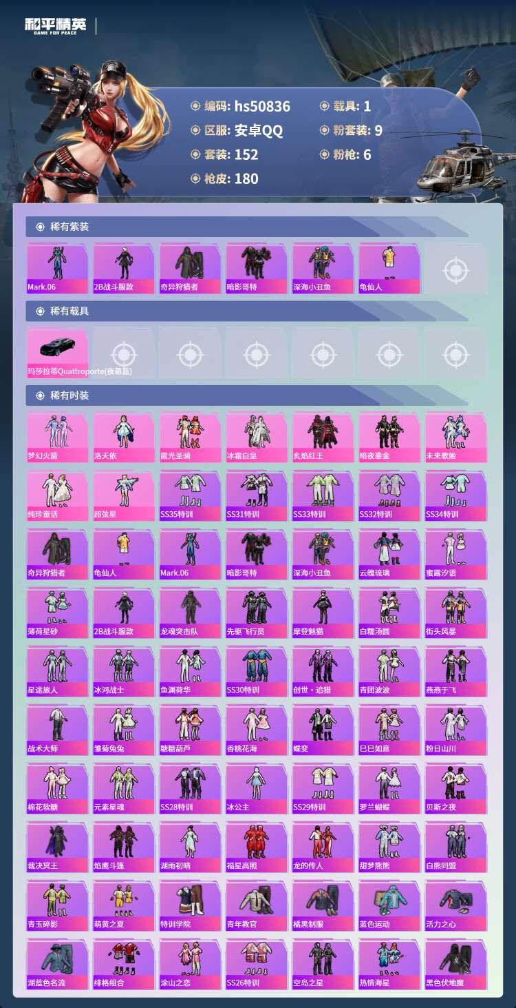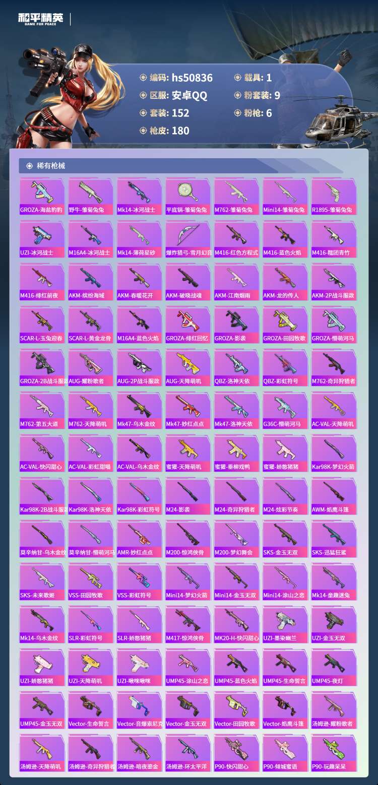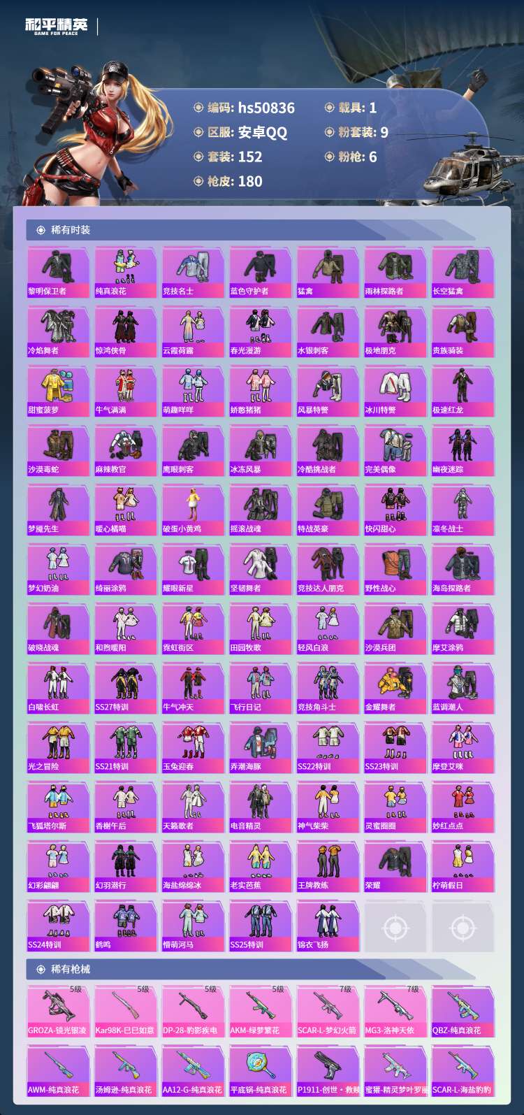 hs50836 安卓手Q-10王牌印记-9粉装-6特效枪-1载具-61072热力值-152套装-18