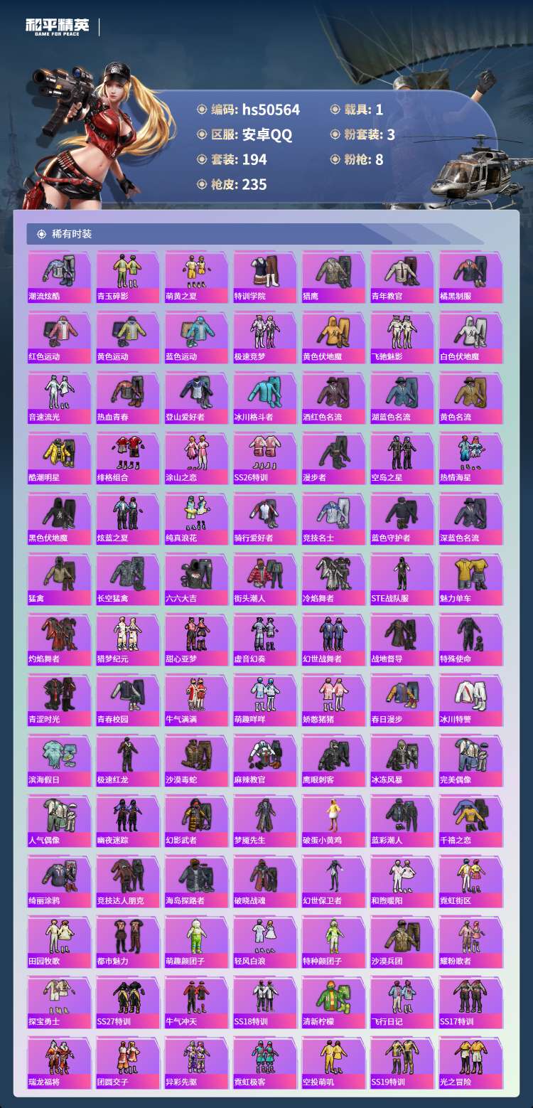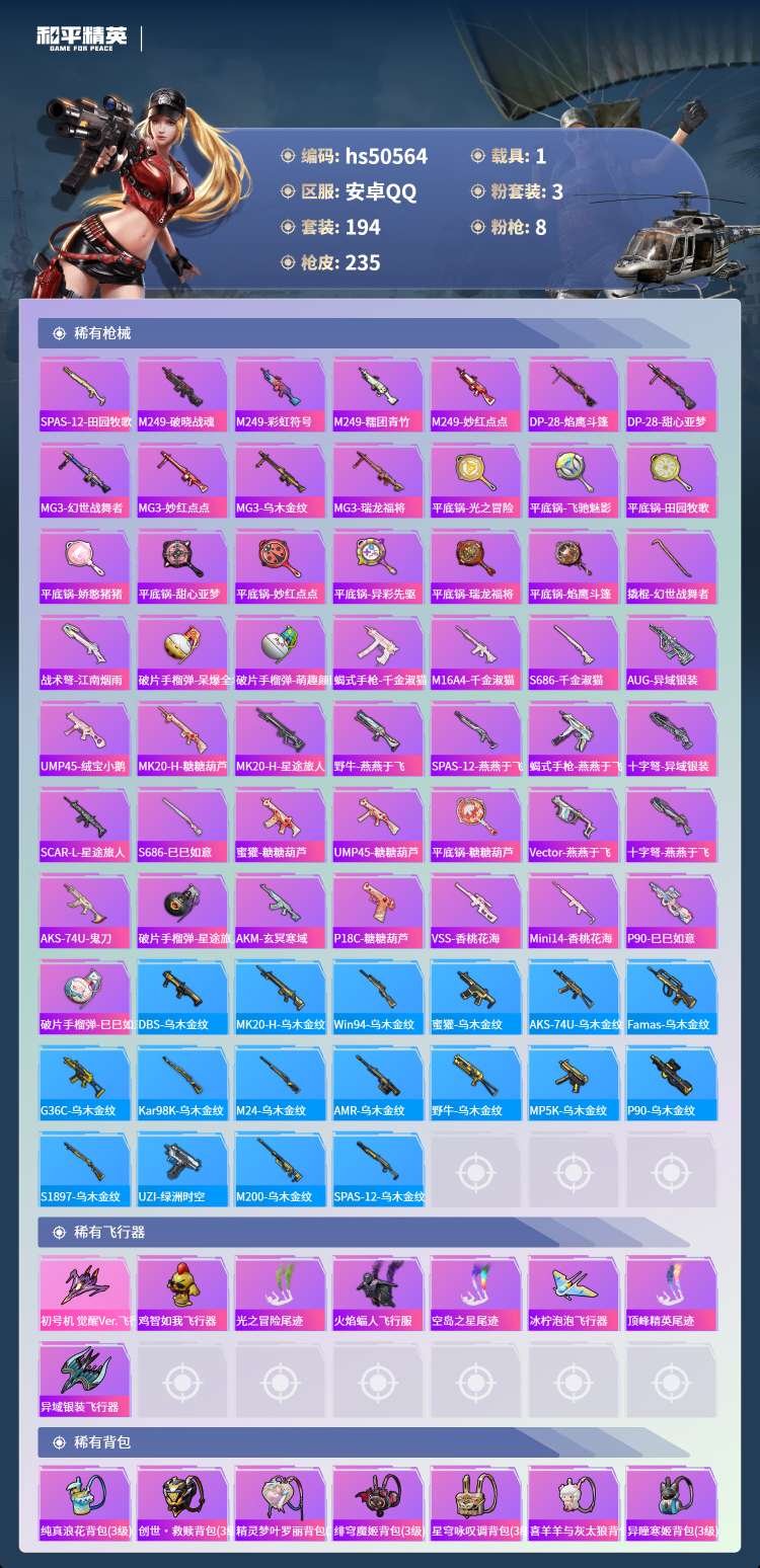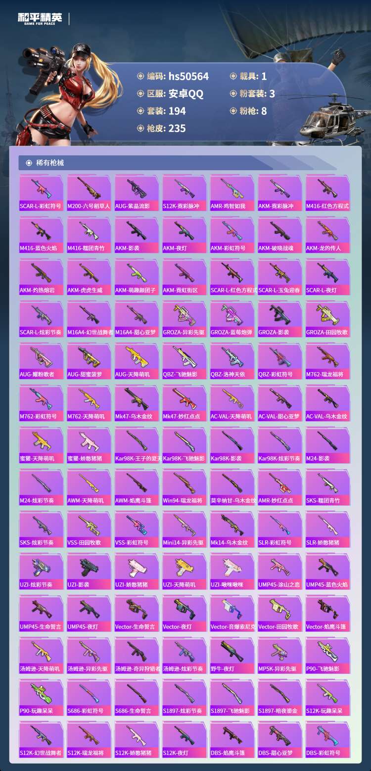 hs50564 安卓手Q-16王牌印记-3粉装-8特效枪-1载具-69799热力值-194套装-23