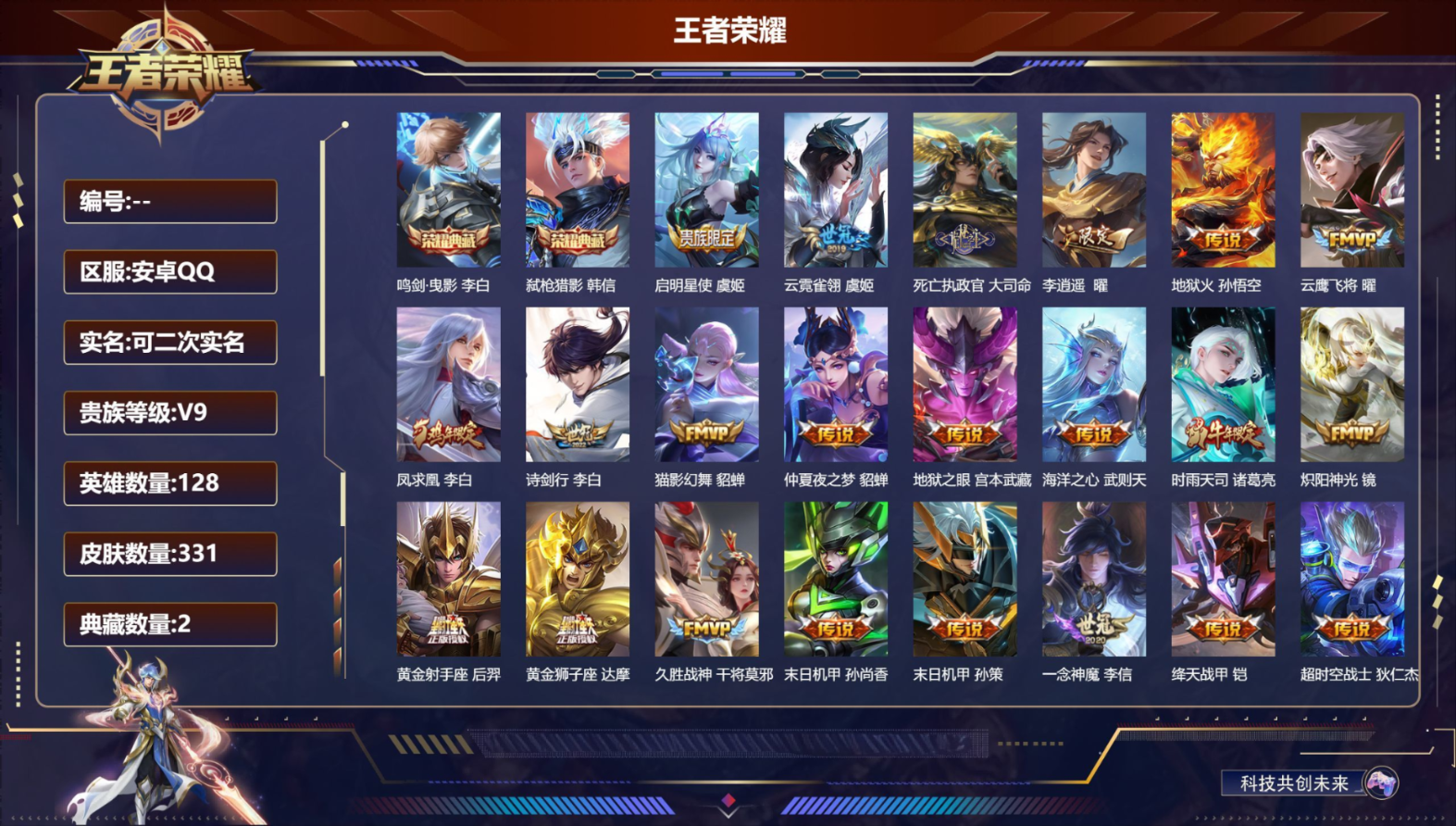 安卓QQ/荣耀王者/331皮肤/128英雄/2典藏/0珍品