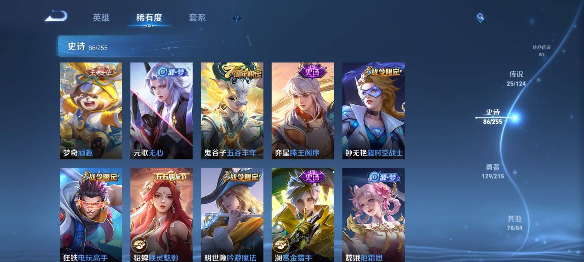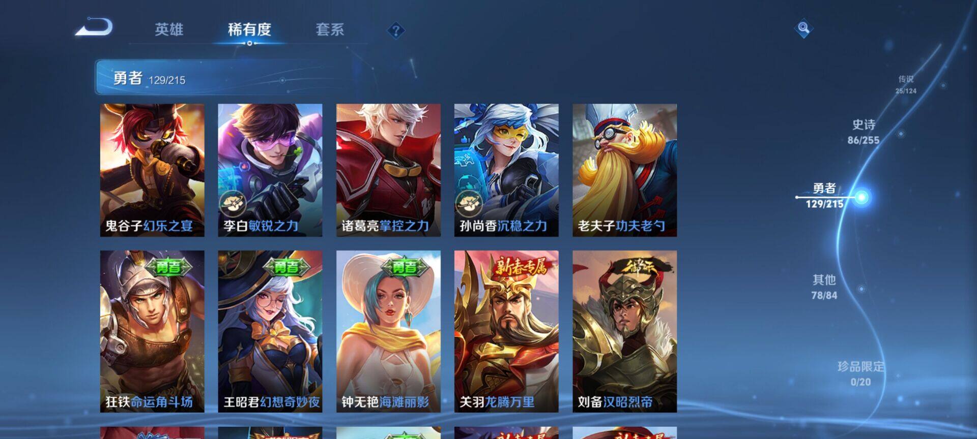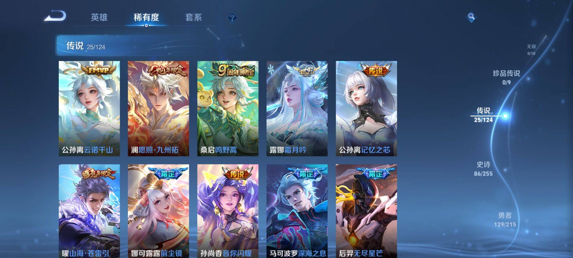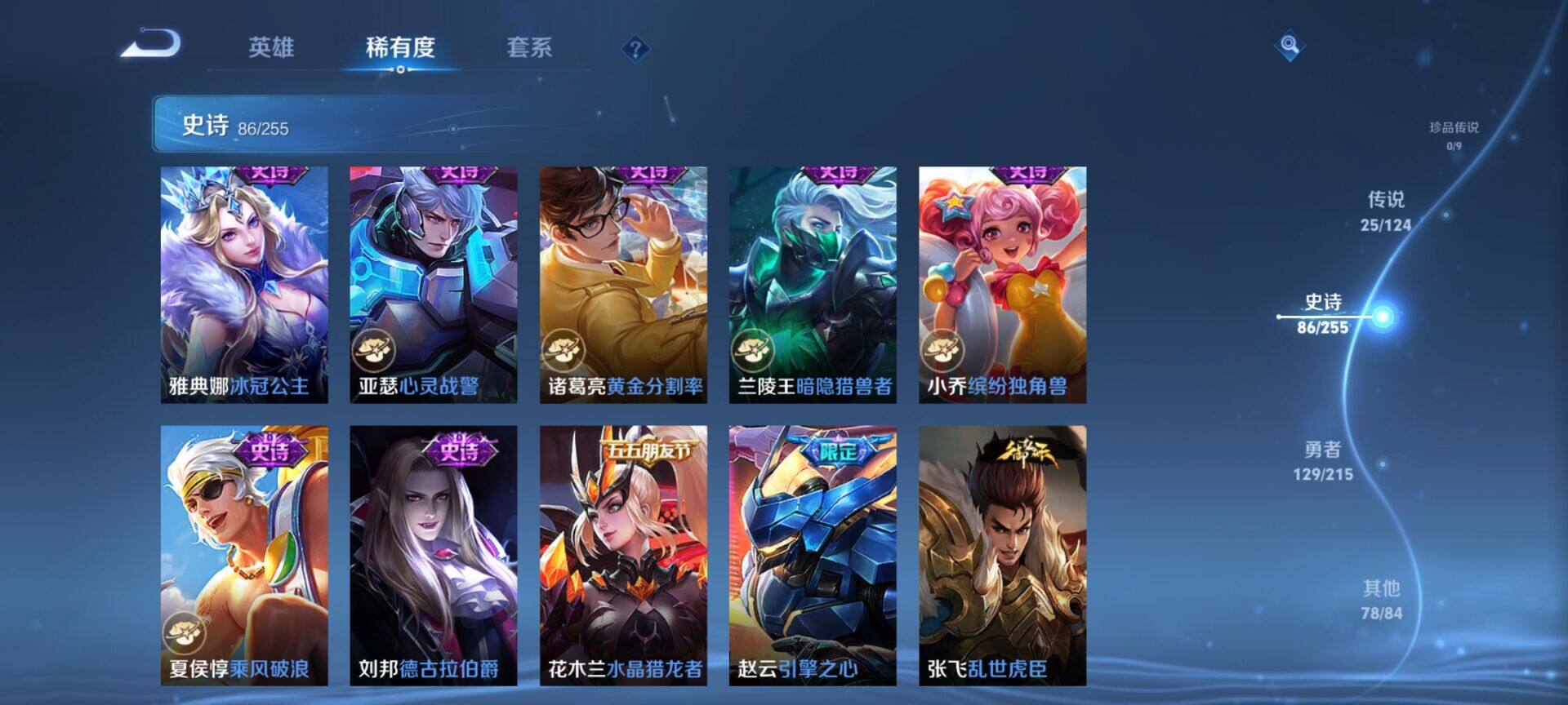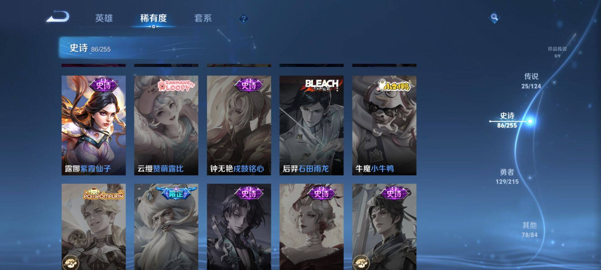 贵族9/皮肤322/典藏4/传说25/史诗86/英雄125/缤纷独角兽/无双飞将/教廷特使/功夫老勺