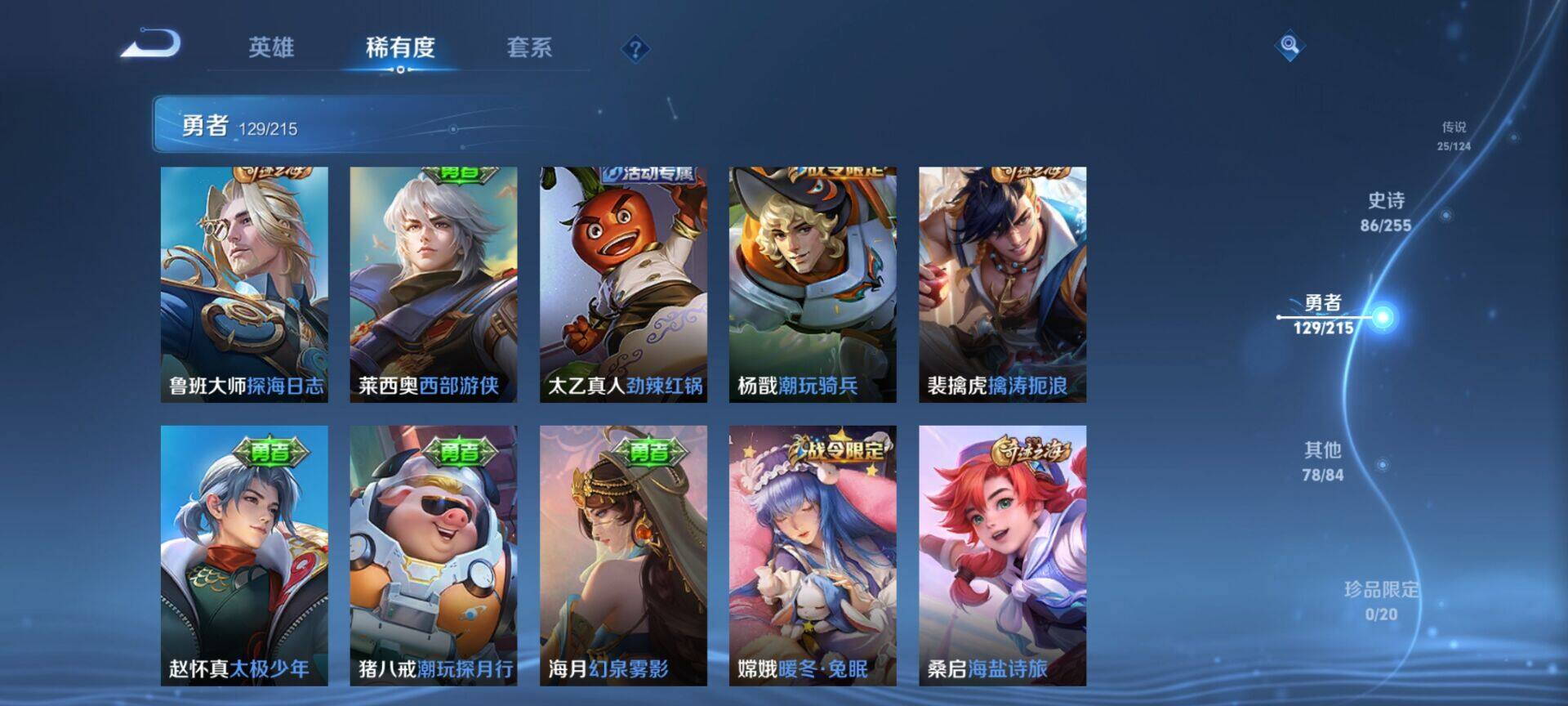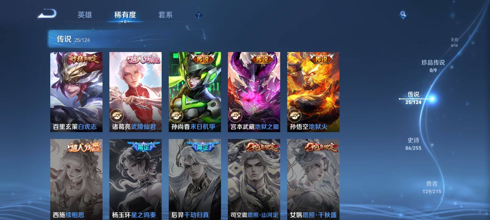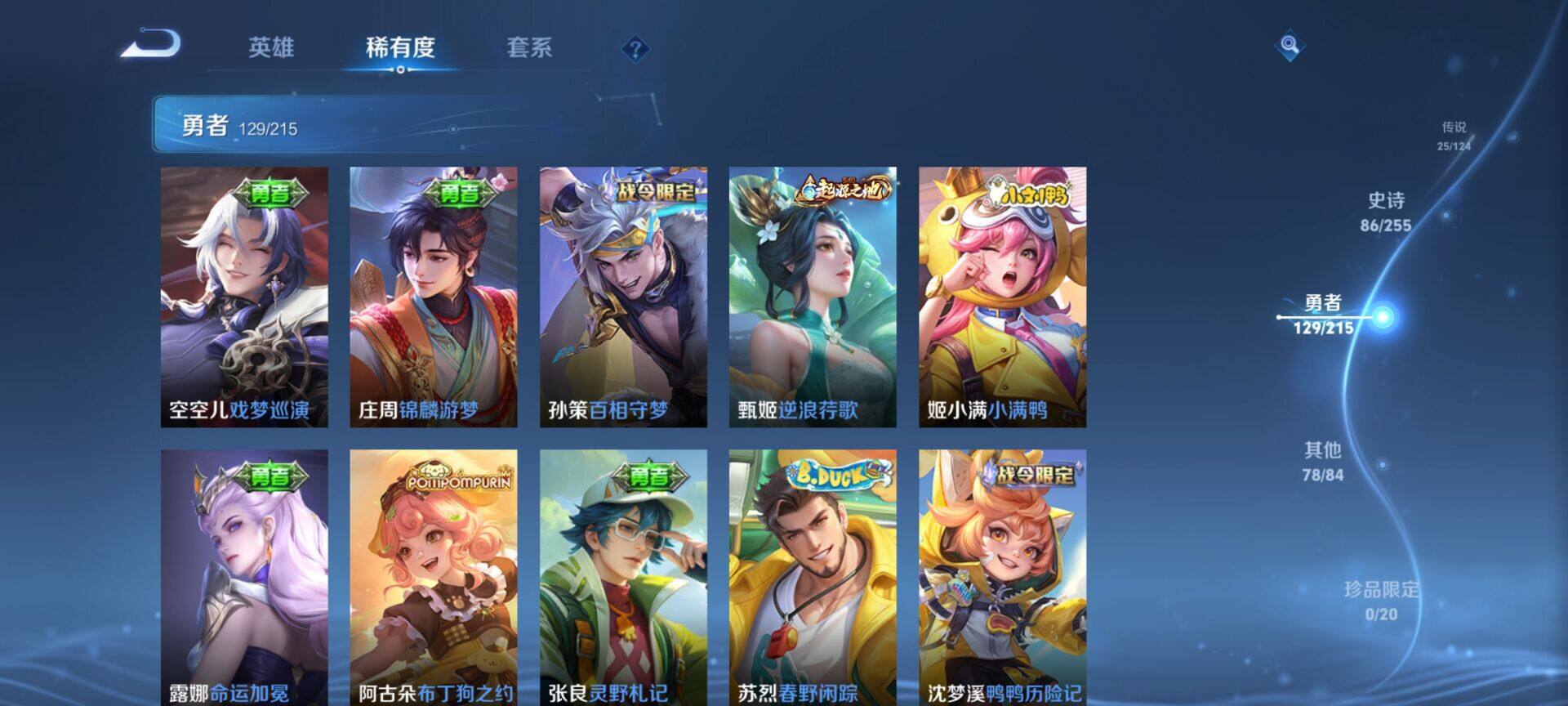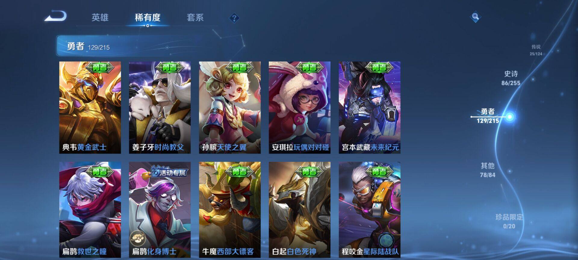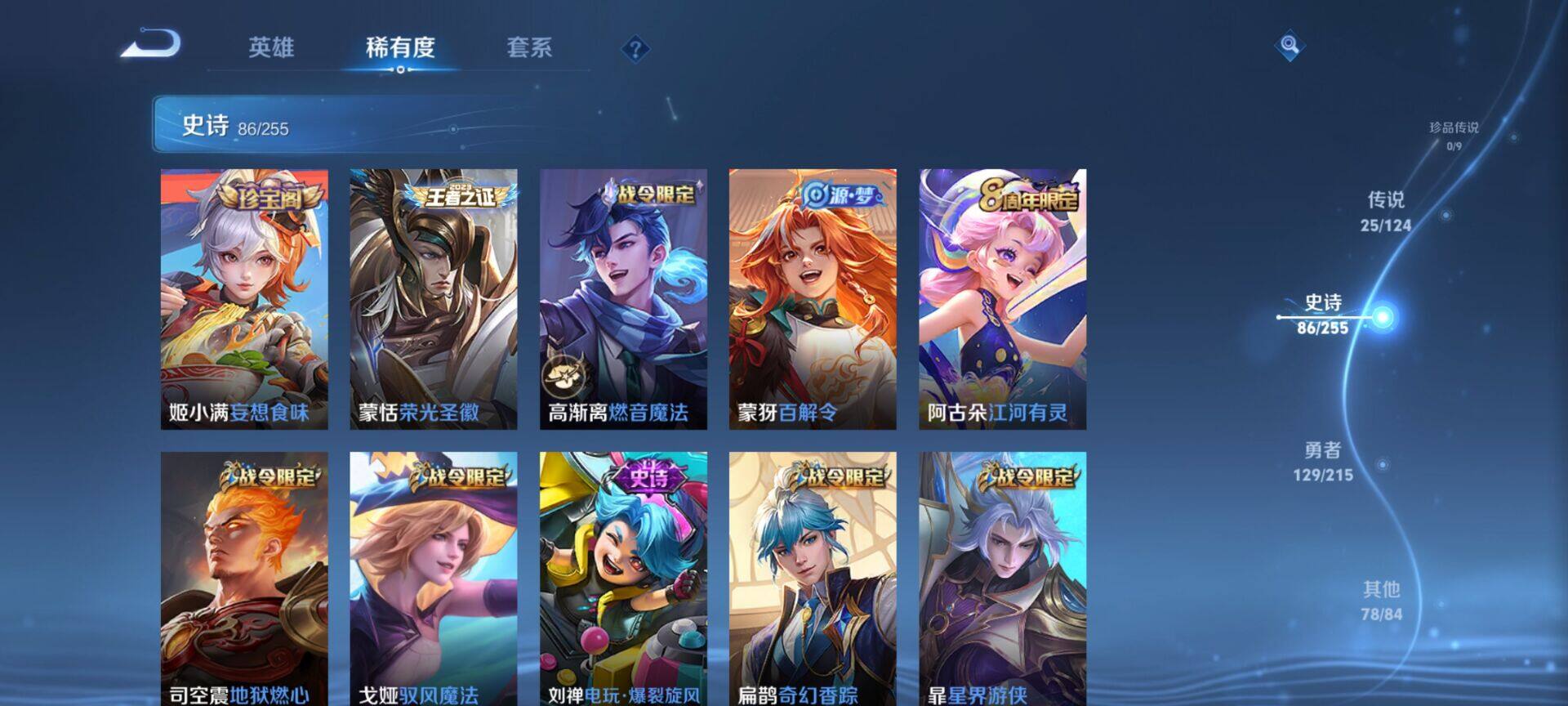 贵族9/皮肤322/典藏4/传说25/史诗86/英雄125/缤纷独角兽/无双飞将/教廷特使/功夫老勺