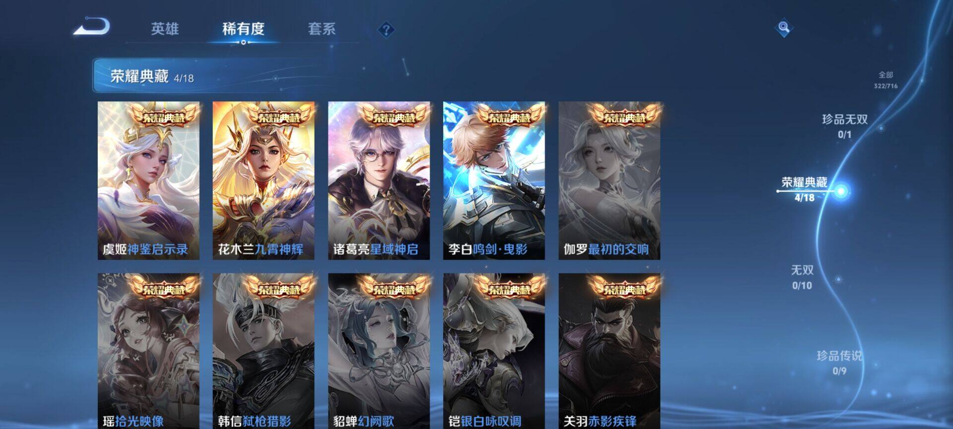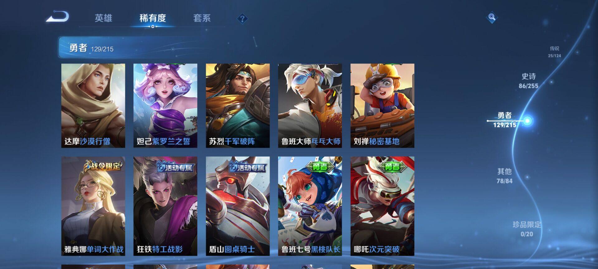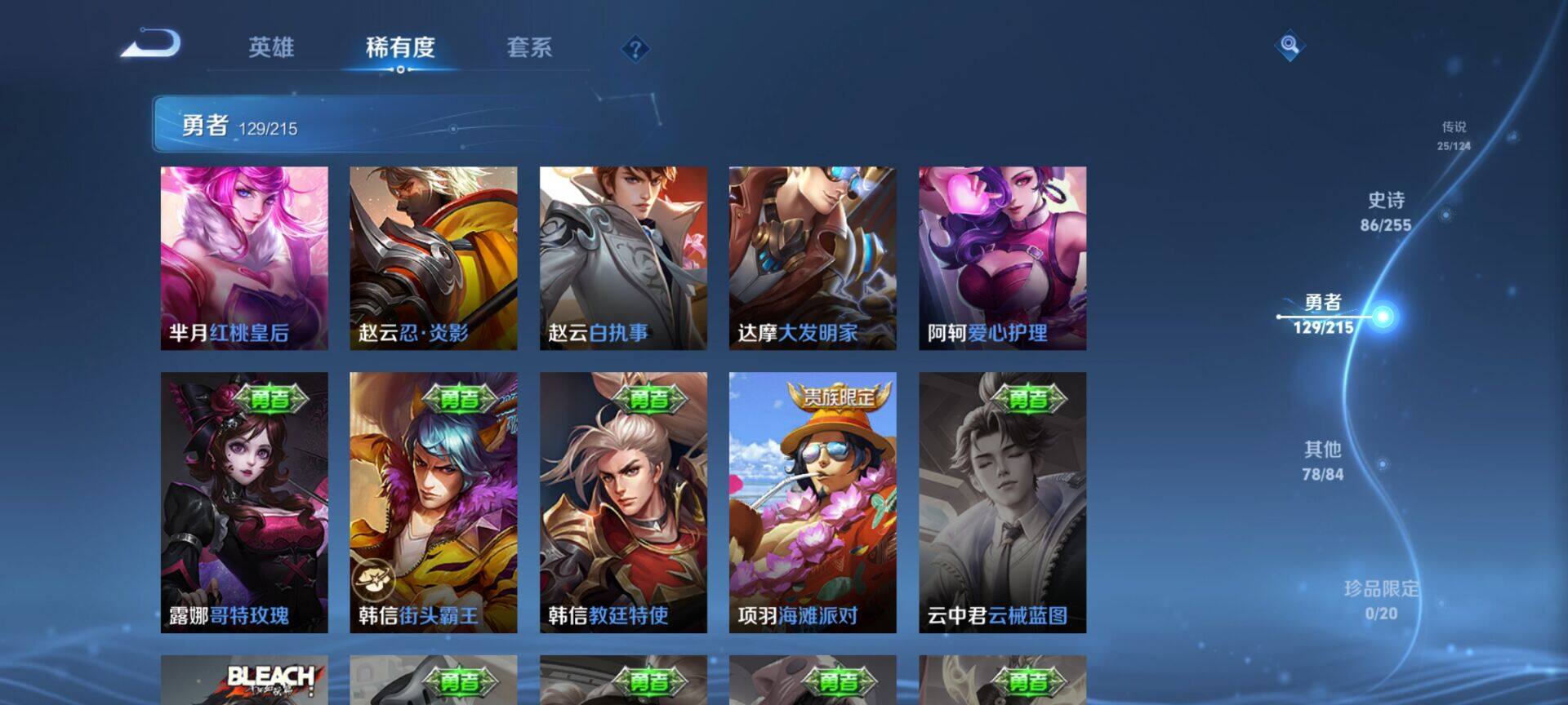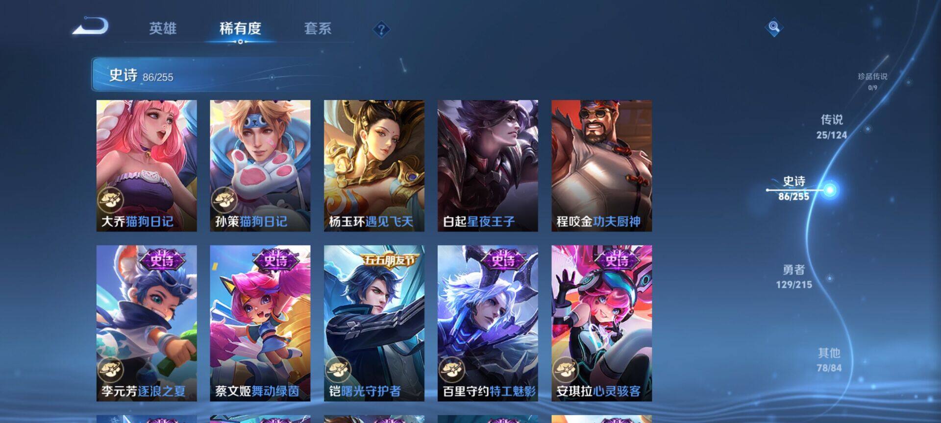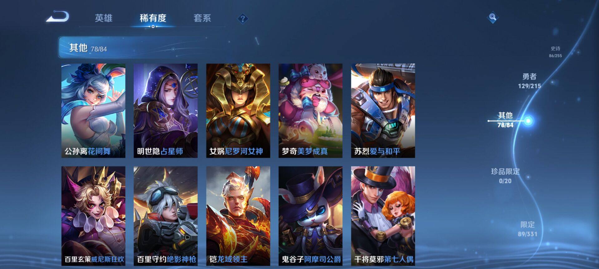 贵族9/皮肤322/典藏4/传说25/史诗86/英雄125/缤纷独角兽/无双飞将/教廷特使/功夫老勺
