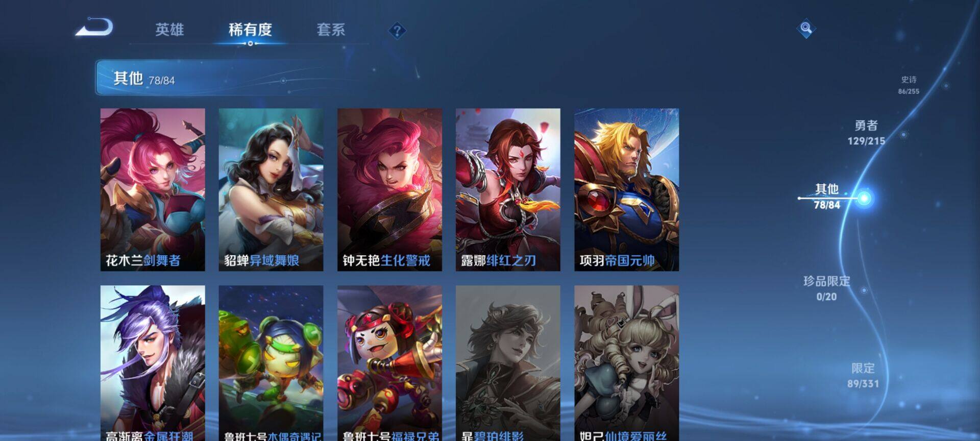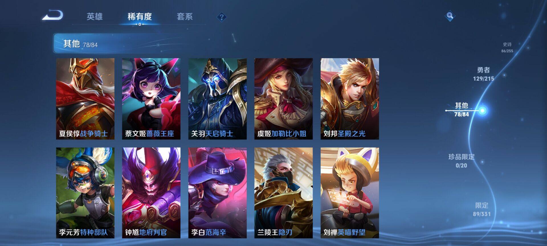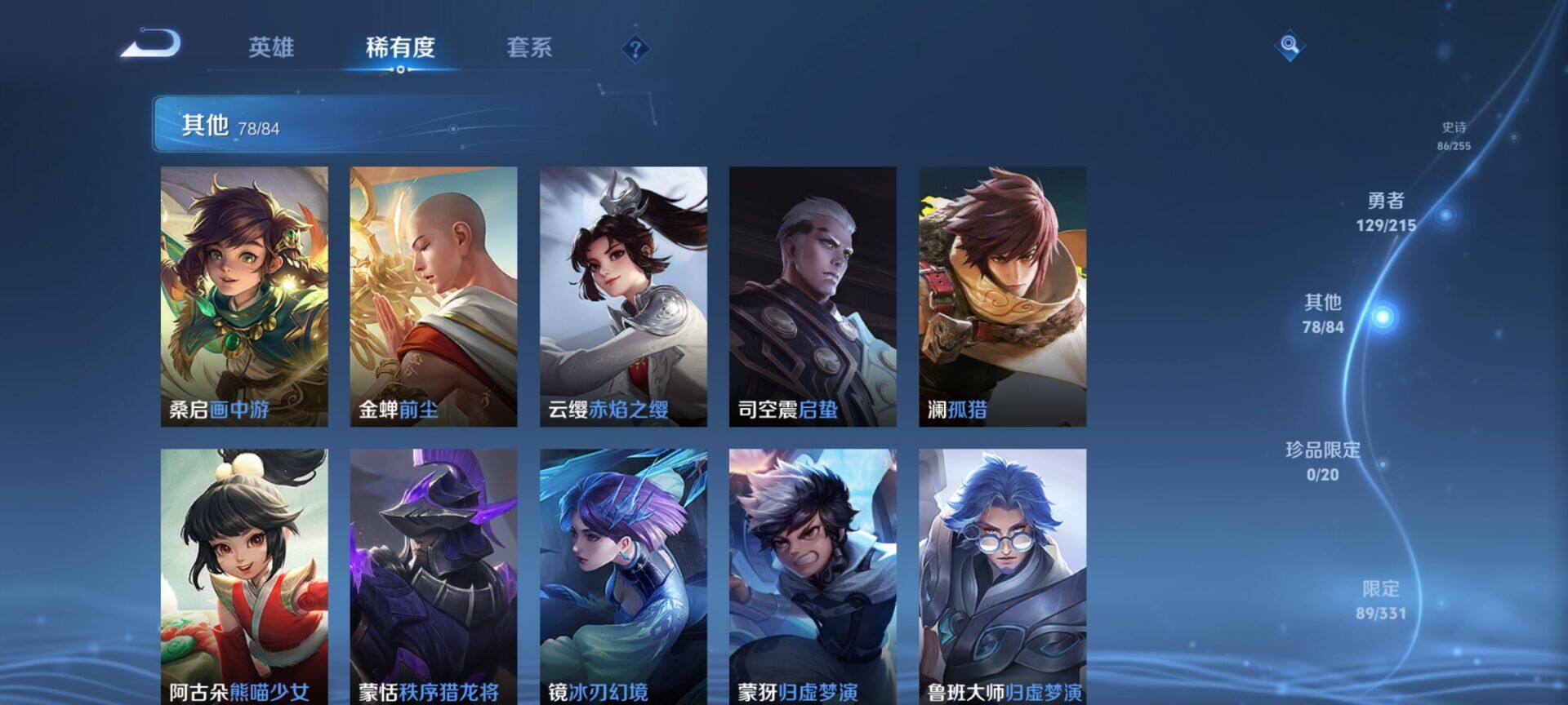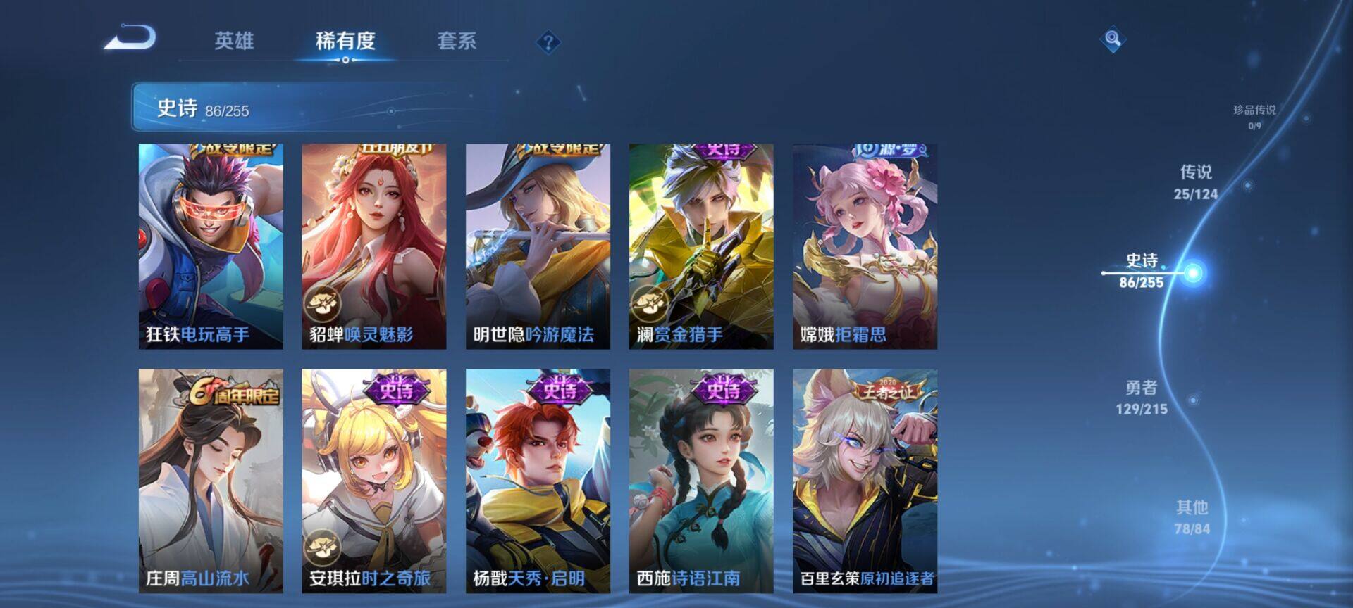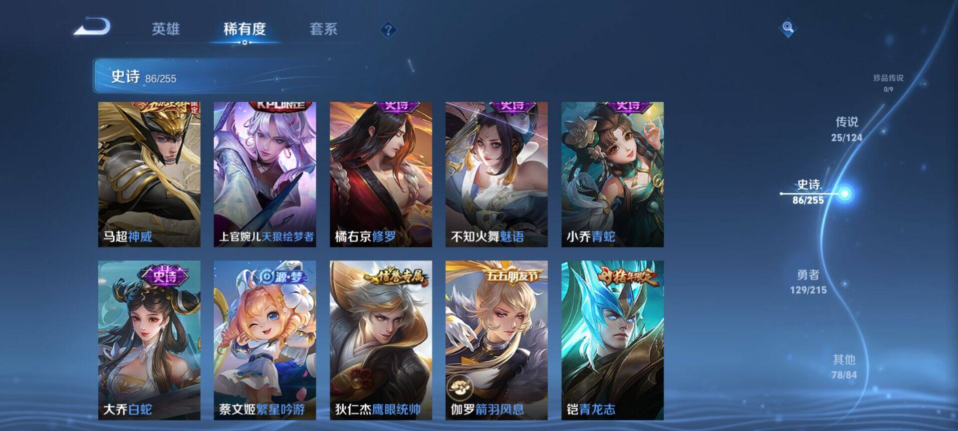 贵族9/皮肤322/典藏4/传说25/史诗86/英雄125/缤纷独角兽/无双飞将/教廷特使/功夫老勺