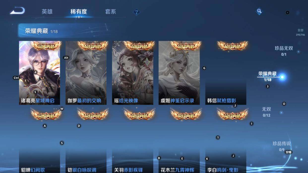 【传说皮肤】:后羿神树通天,吕布曦玄引,孙尚香乘龙问璇玑,狄仁杰夜礼服假面,诸葛亮时雨天司,虞姬启明星使,孙悟空零号赤焰,刘备时之恋人,达摩黄金狮子座
