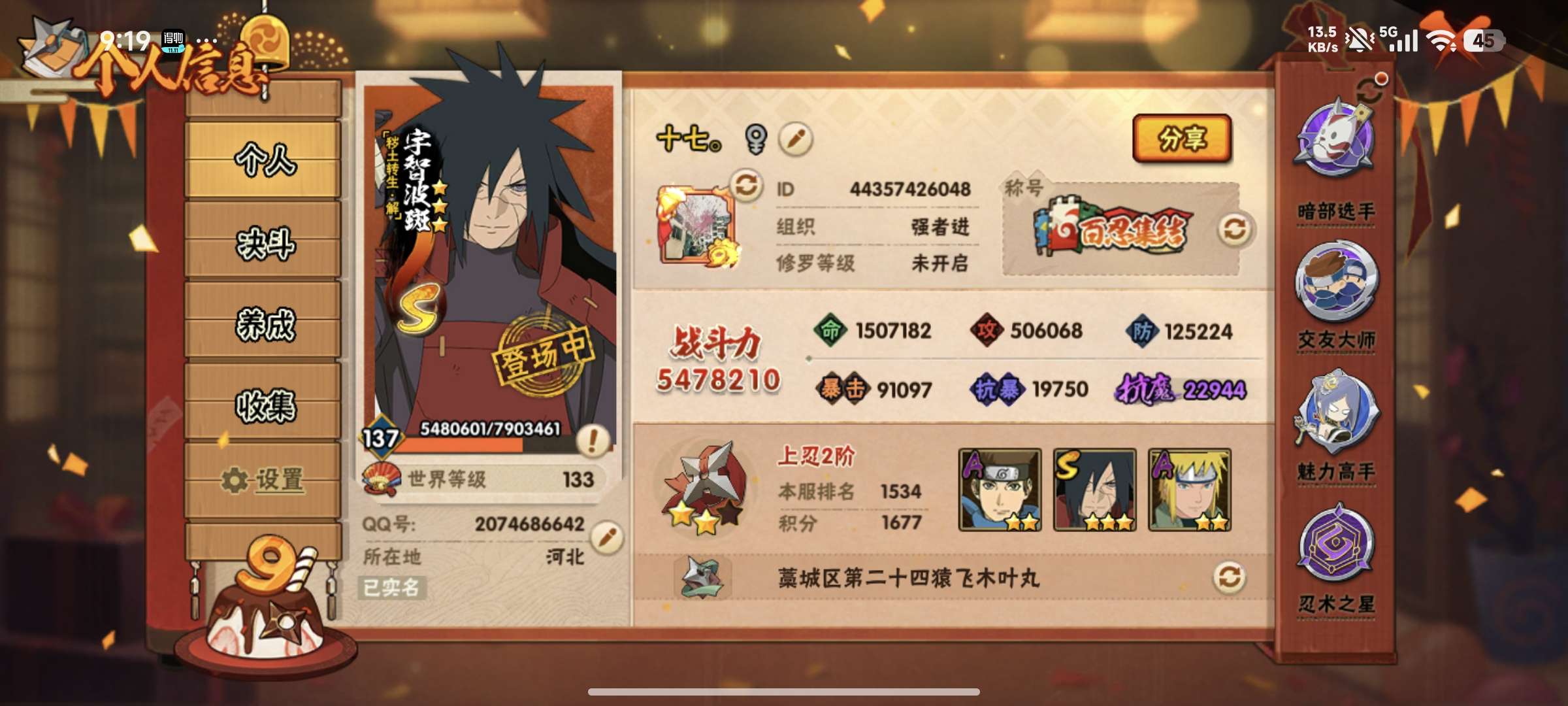 火影忍者自玩号,有解斑,须佐卡卡西,骨架,清水,500多万战力