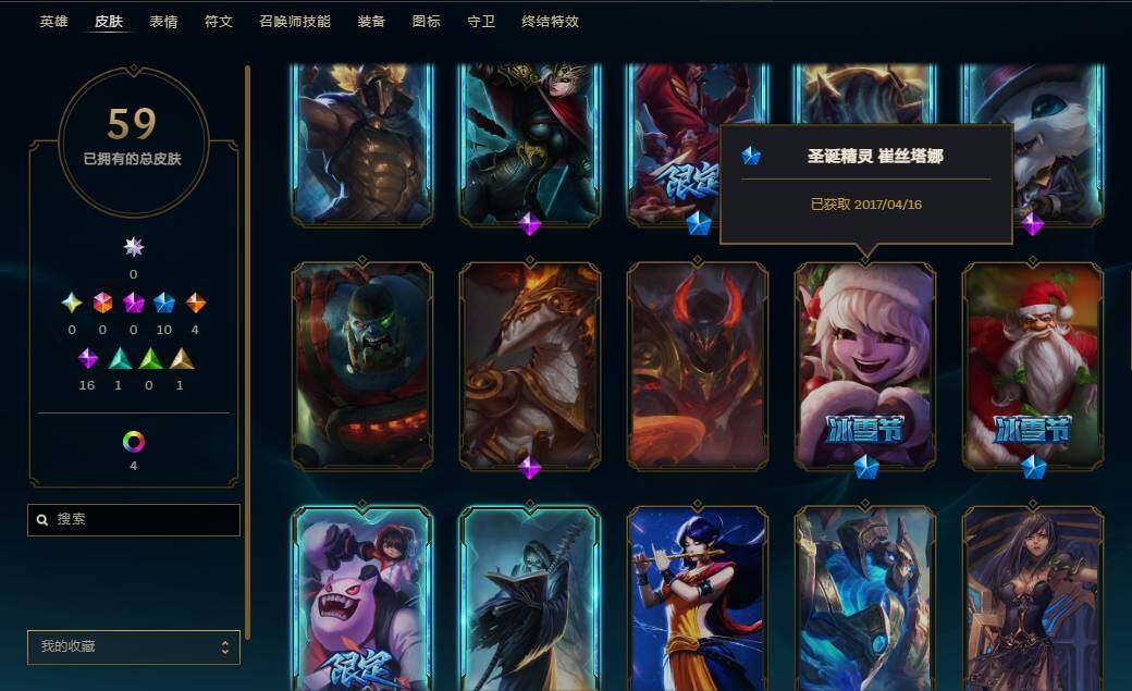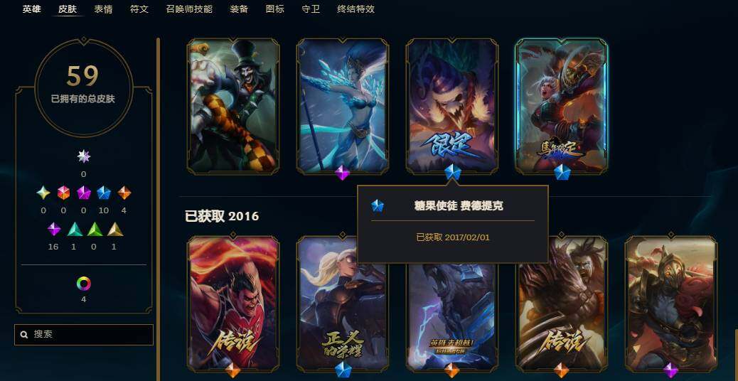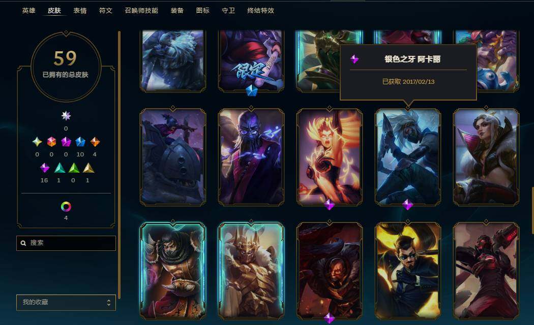 90英雄/59皮肤/10限定/4炫彩/4传说