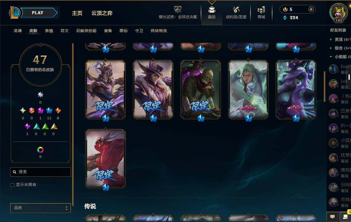125英雄/47皮肤/1神话/11限定/4臻彩
