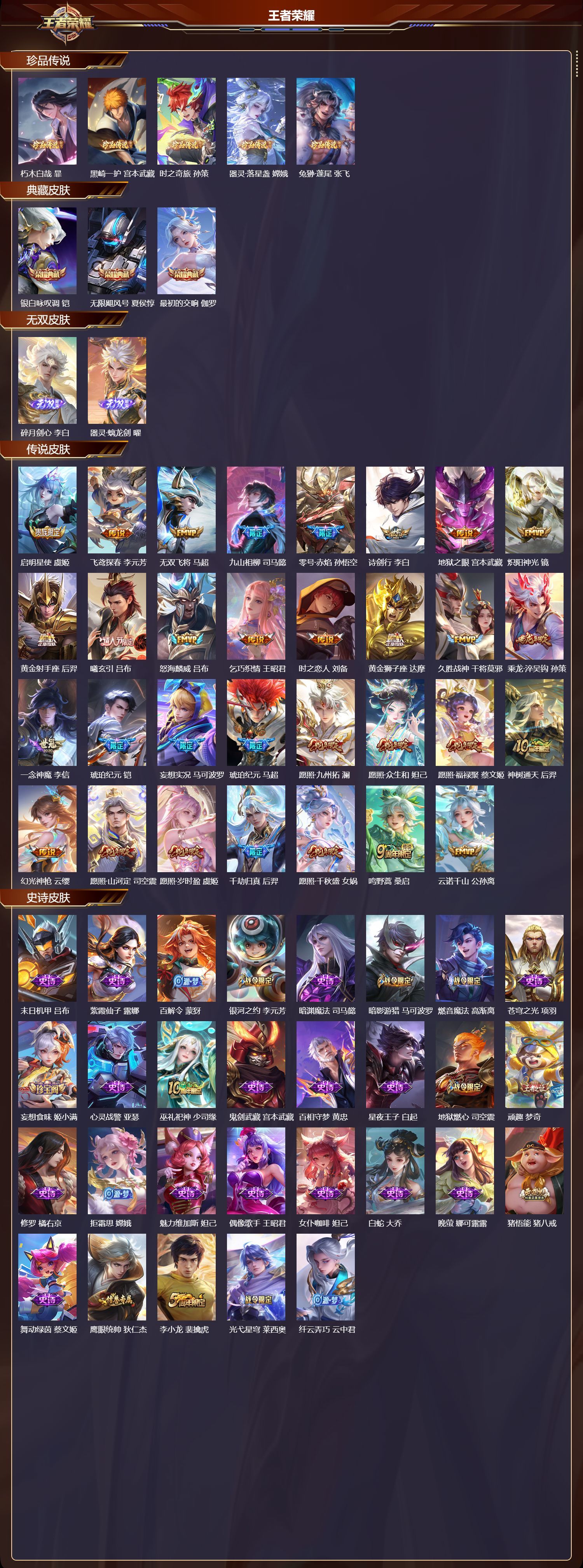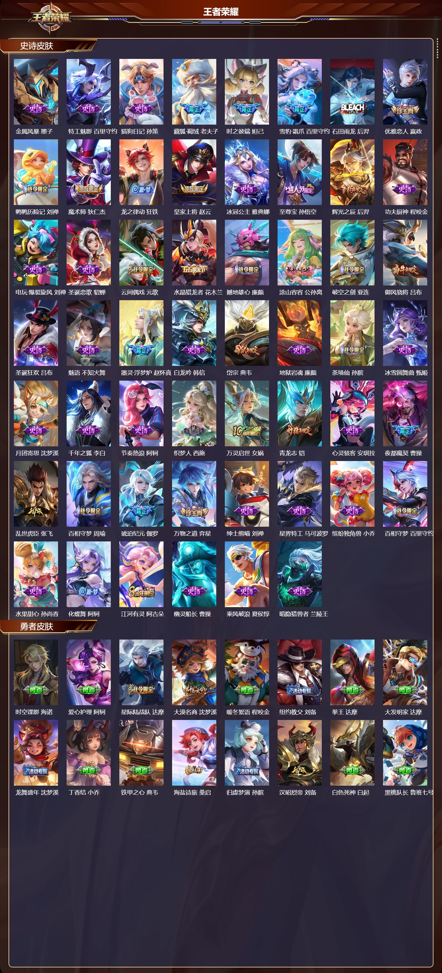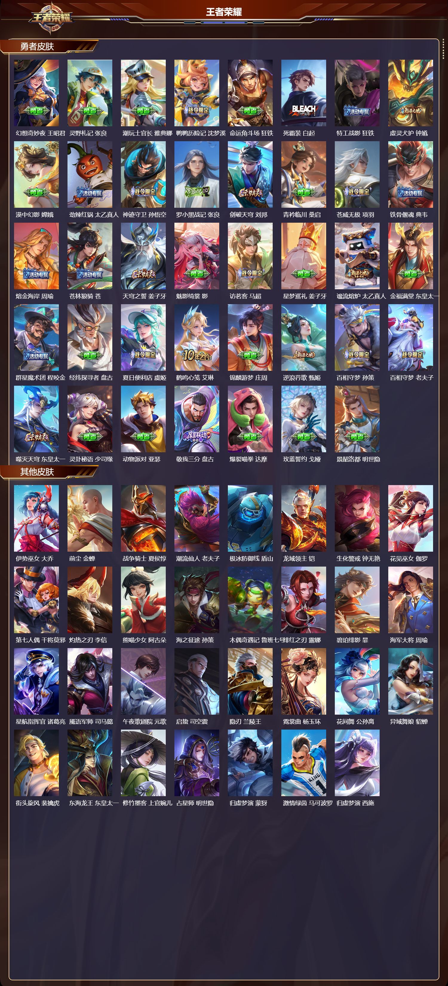 安卓QQ/无双王者/296皮肤/126英雄/3典藏/0珍品无双/2无双/5珍品传说/31传说/83史
