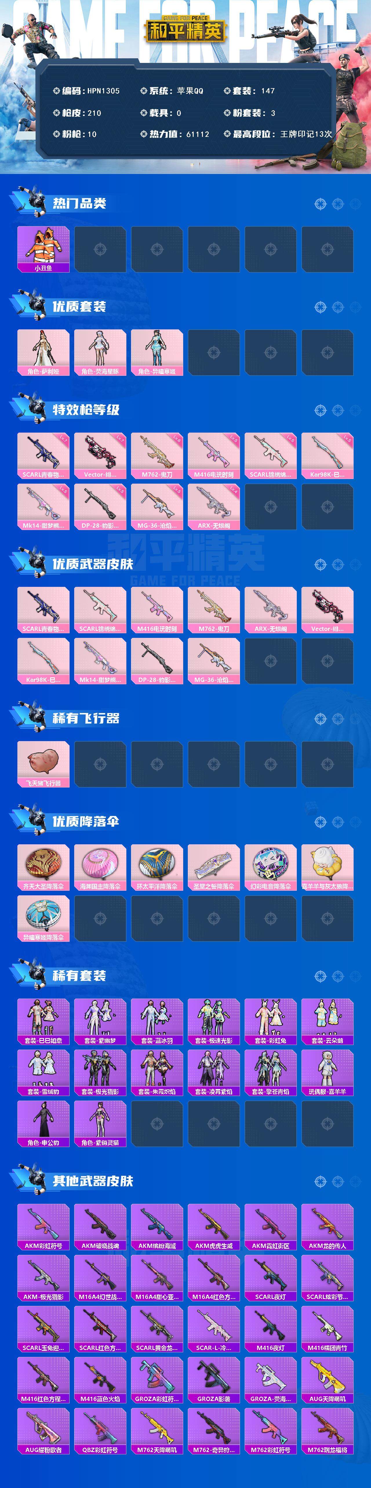 【HPN1305】147套装/枪械10/装备221/战备133/王牌印记13/热力值61112/七级SCAR-L-青春物语/五级SCAR-L-锦绣绵绵/五级M416-电玩时刻/六级M762-鬼刀/四级ARX-无垠阁/七级Vector-绯穹魔姬/五级Kar98K-巳巳如意/五级Mk14-甜梦熊击/五级DP-28-豹影疾电/五级MG-36-沧焰双生/套装-浪漫天命/深海小丑鱼/小丑鱼/套装-龟仙人/套装-暗影哥特/角色-萨利娅/角色-荧海星豚/角色-异瞳寒姬/SCAR-L-青春物语/SCAR-L-锦