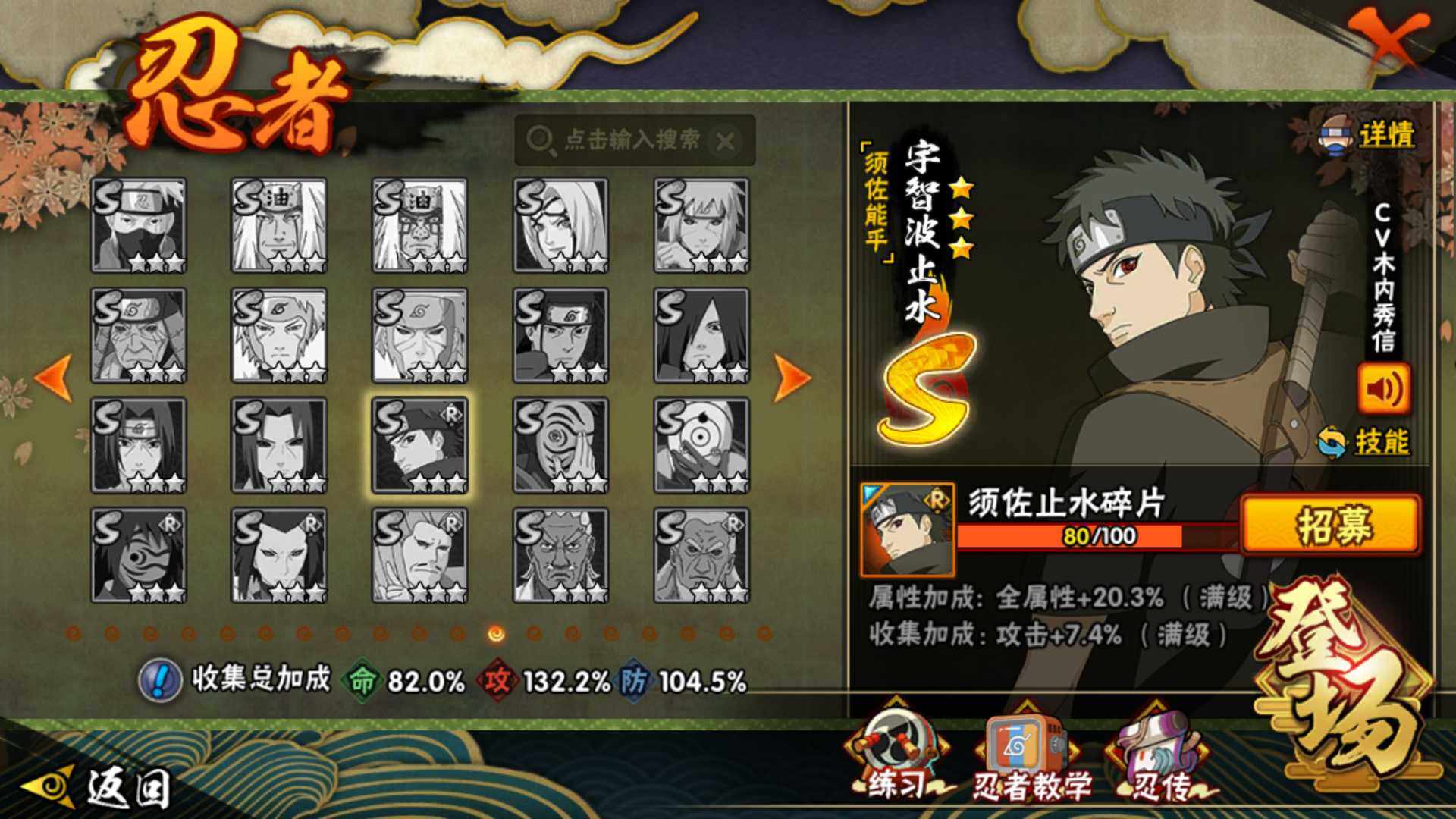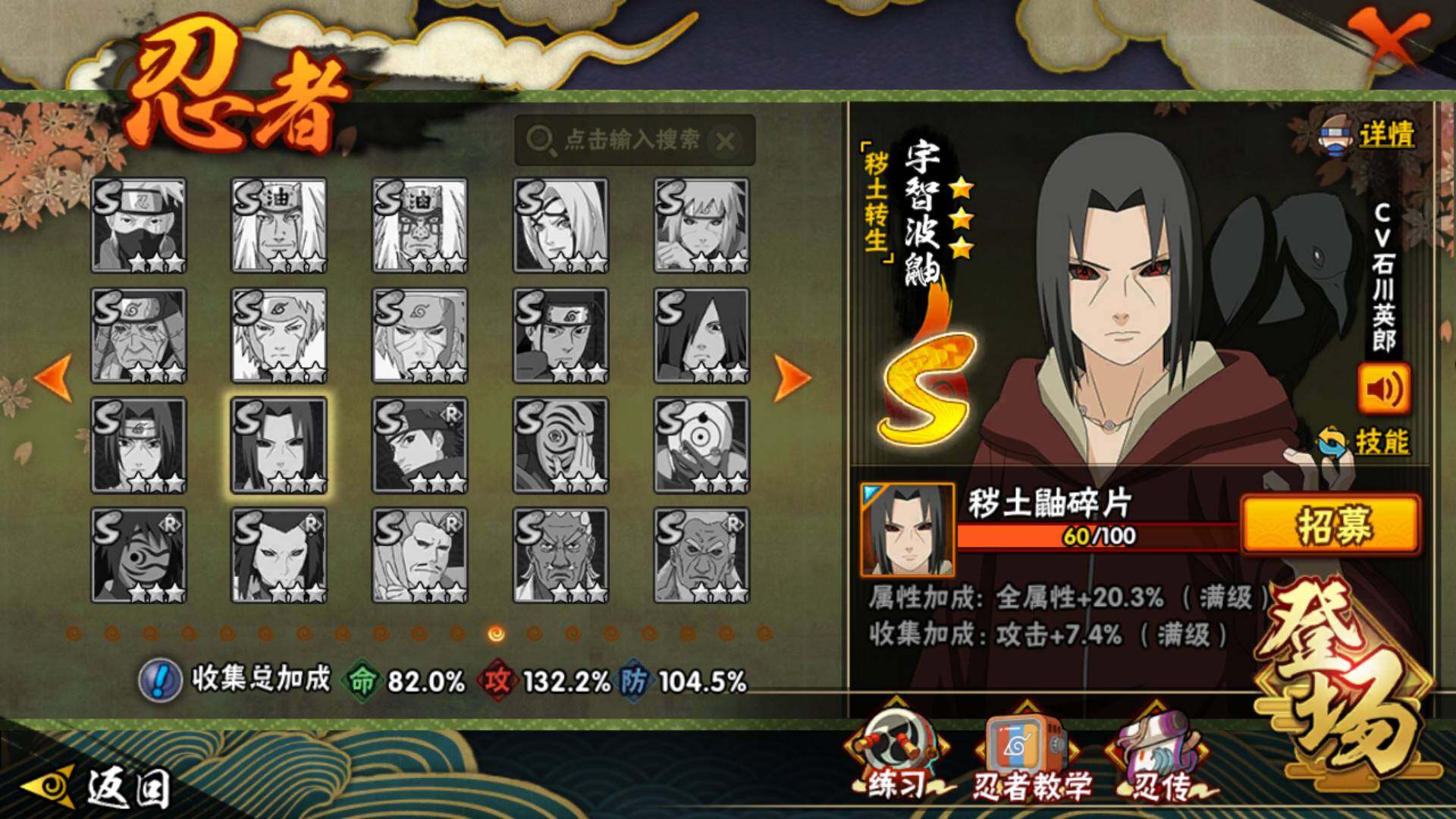 【S级忍者】:千手柱间「秽土转生」(3星),宇智波斑「秽土转生」(3星),宇智波斑「秽土转生·解」(3星),大野木「忍界大战」(3星),春野樱「忍界大战」(3星),宇智波带土「忍界大战」(3星),艾「忍界大战」(3星),宇智波斑「木叶创立」(3星),千