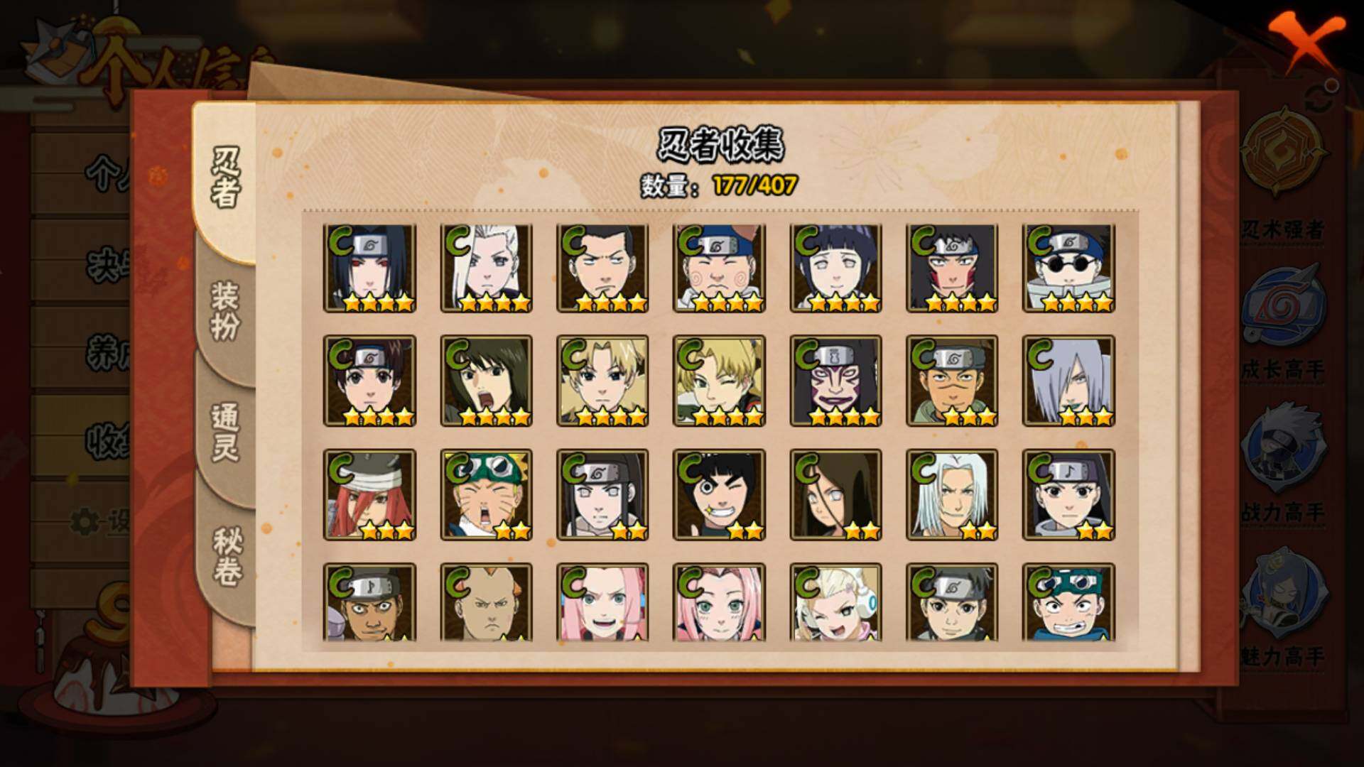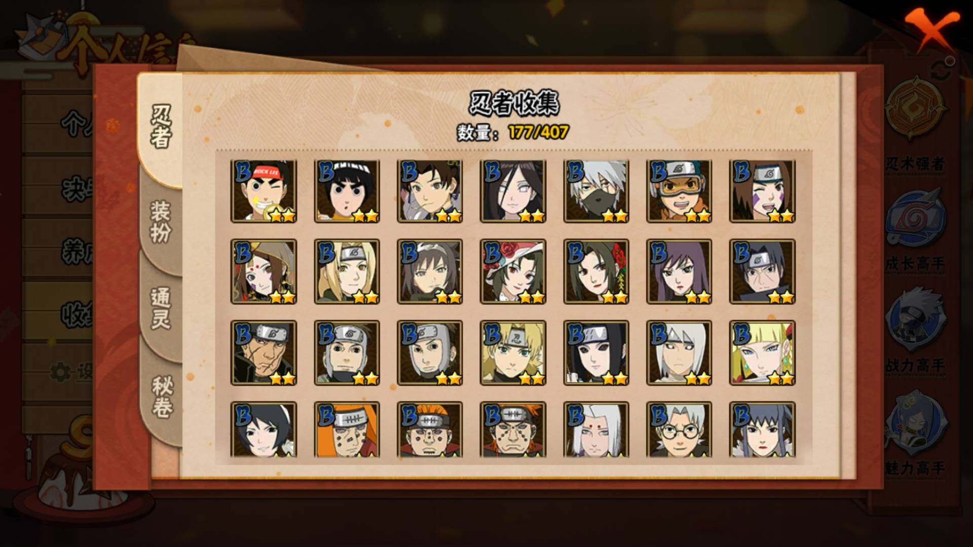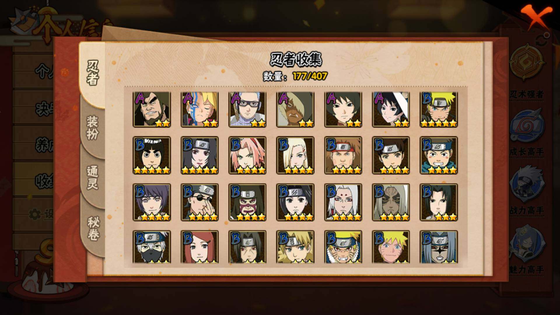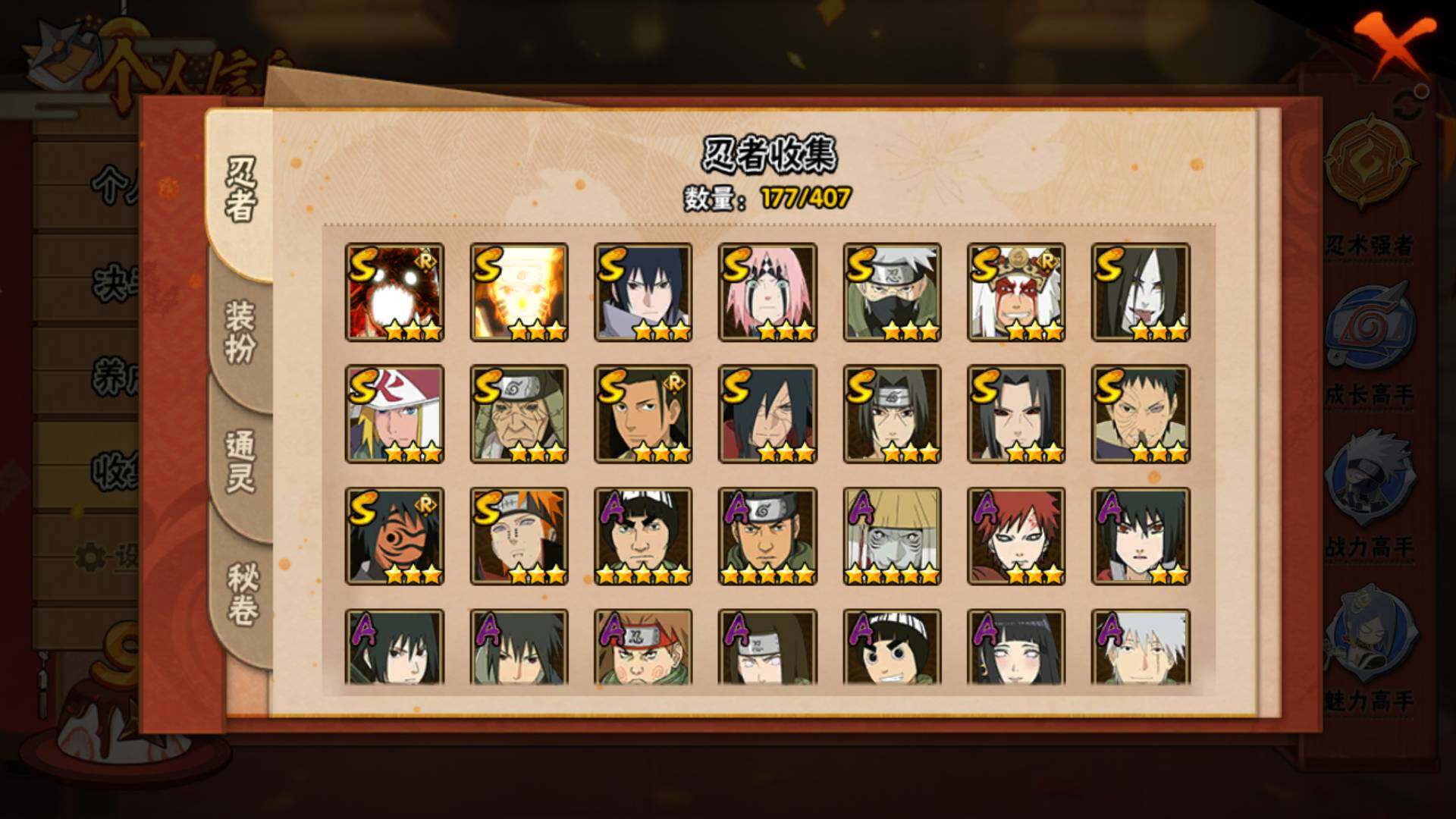 【S级忍者】:猿飞日斩「秽土转生」(3星),宇智波鼬「秽土转生」(3星),宇智波斑「秽土转生·解」(3星),春野樱「忍界大战」(3星),宇智波带土「忍界大战」(3星),宇智波鼬「须佐能乎」(3星),旗木卡卡西「须佐能乎」(3星),千手柱间「木叶创立」(3星),自来也「舞之豪杰」(3星),大蛇丸(3星),波