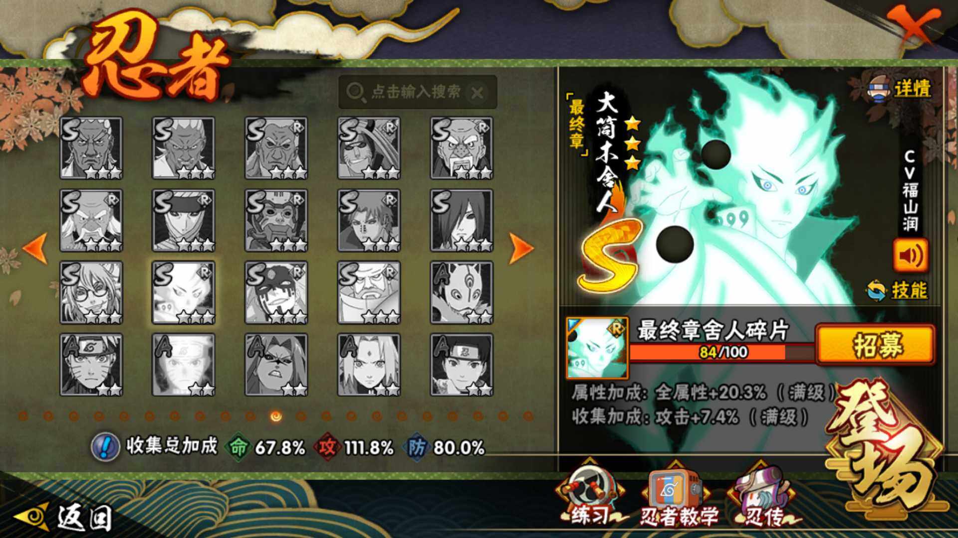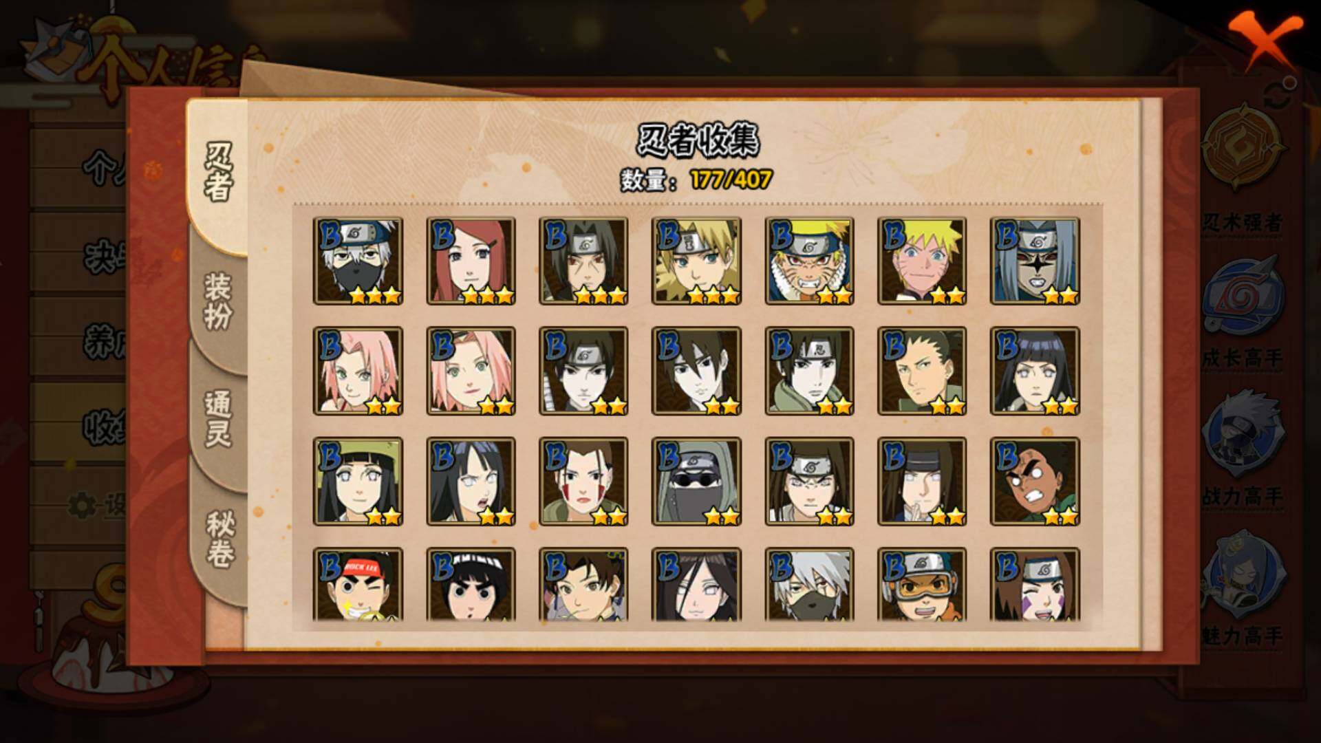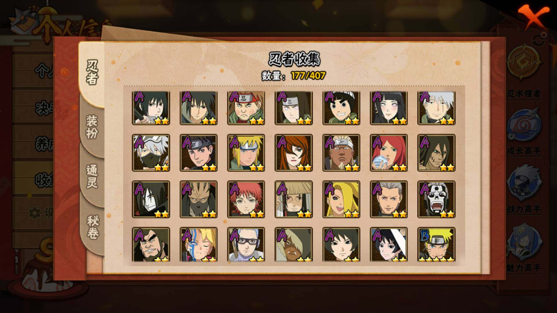 【S级忍者】:猿飞日斩「秽土转生」(3星),宇智波鼬「秽土转生」(3星),宇智波斑「秽土转生·解」(3星),春野樱「忍界大战」(3星),宇智波带土「忍界大战」(3星),宇智波鼬「须佐能乎」(3星),旗木卡卡西「须佐能乎」(3星),千手柱间「木叶创立」(3星),自来也「舞之豪杰」(3星),大蛇丸(3星),波