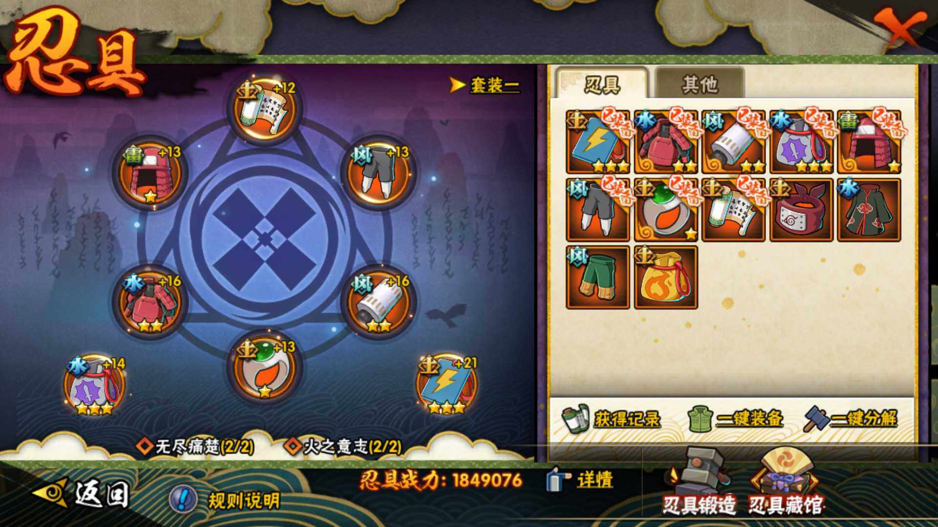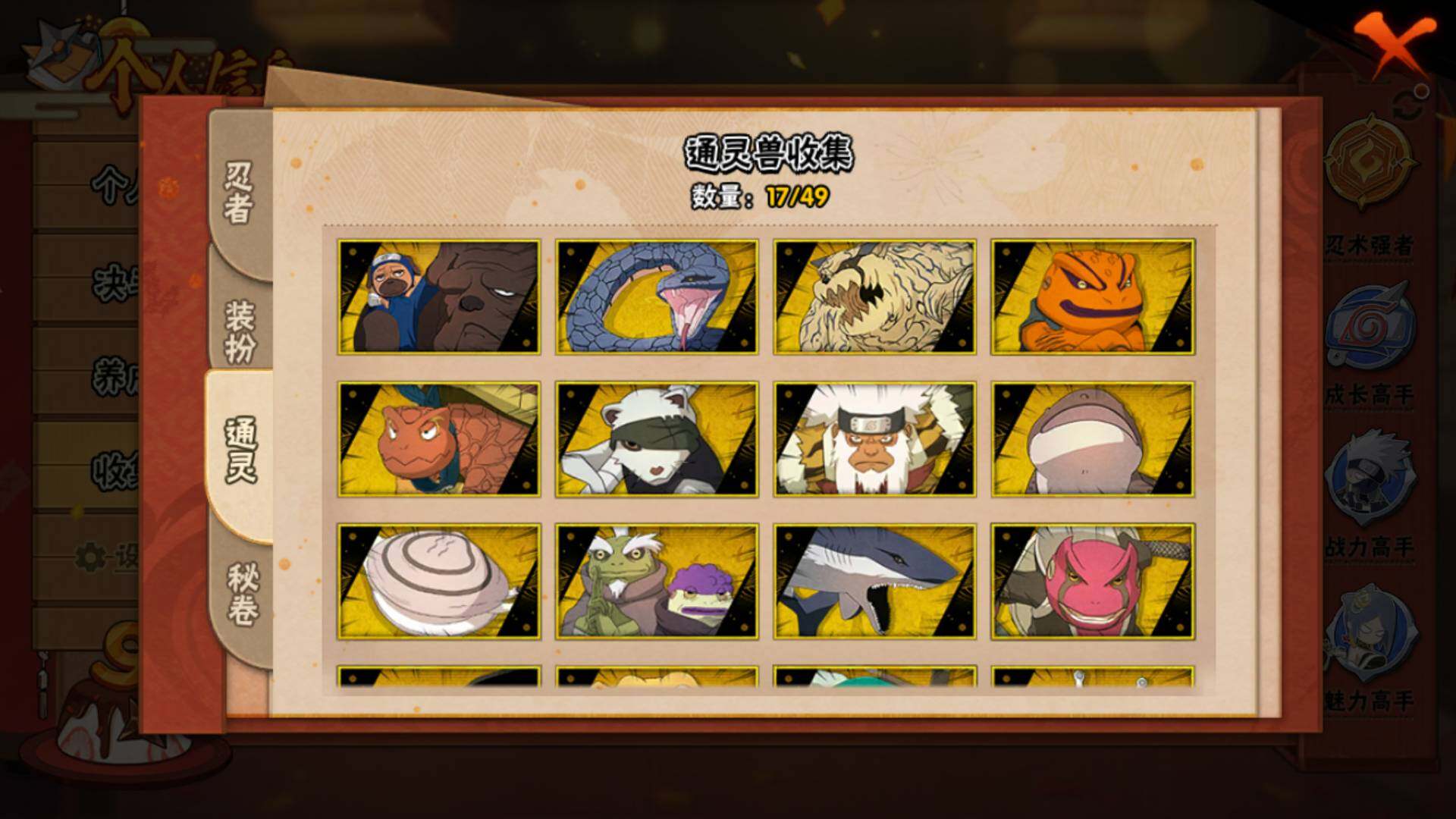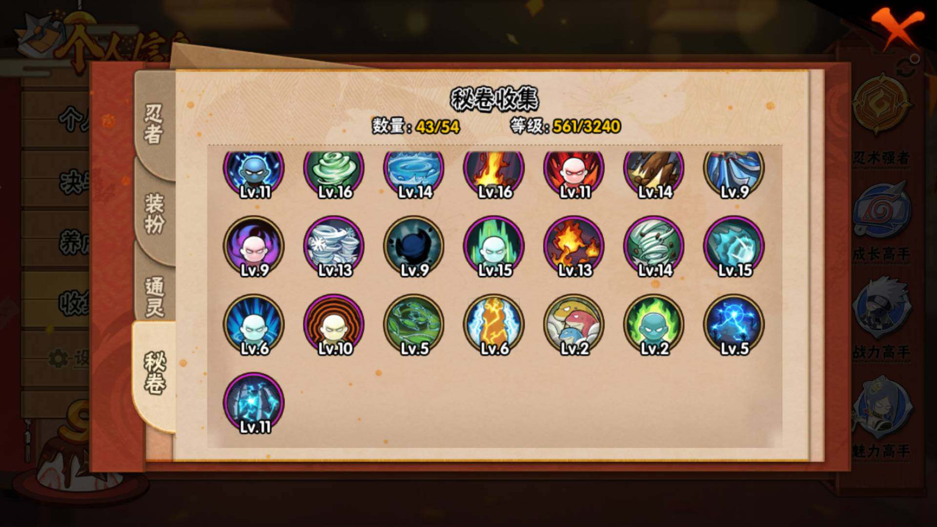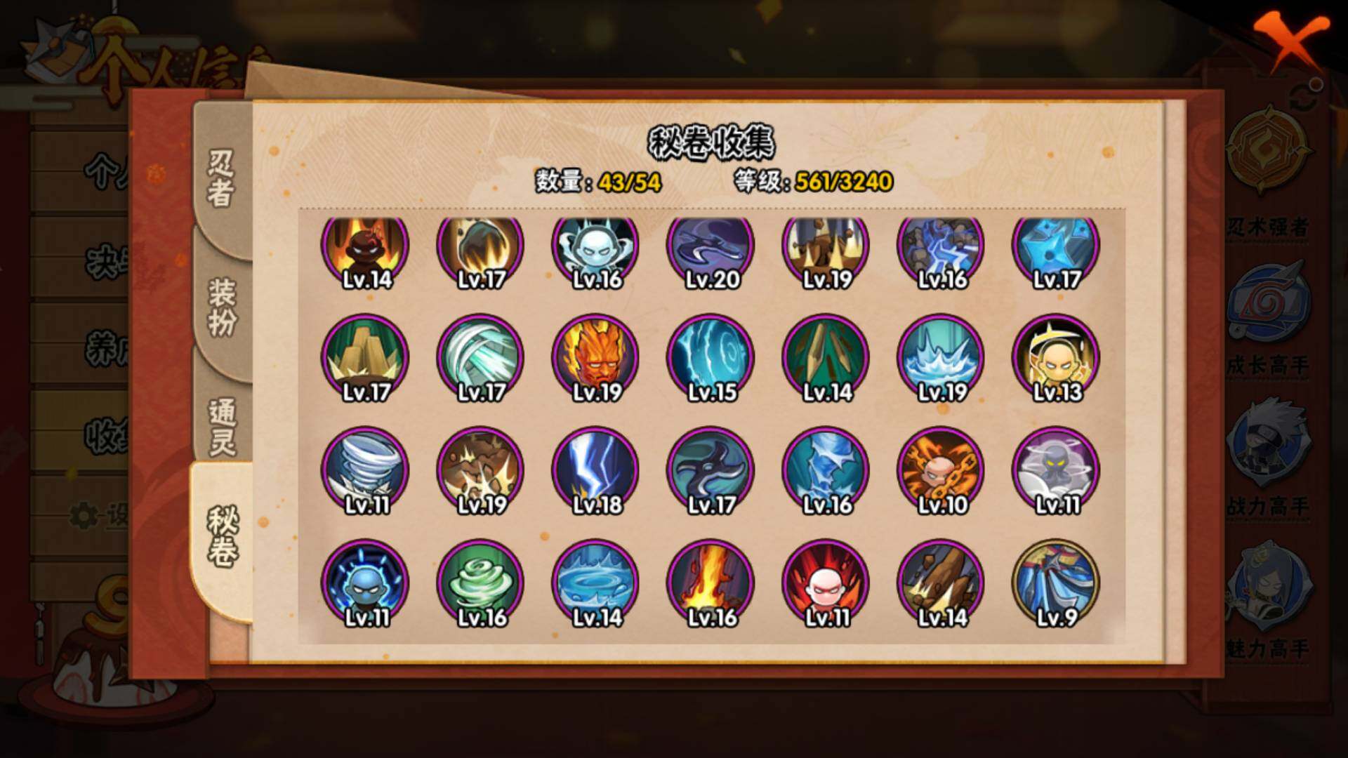 【S级忍者】:猿飞日斩「秽土转生」(3星),宇智波鼬「秽土转生」(3星),宇智波斑「秽土转生·解」(3星),春野樱「忍界大战」(3星),宇智波带土「忍界大战」(3星),宇智波鼬「须佐能乎」(3星),旗木卡卡西「须佐能乎」(3星),千手柱间「木叶创立」(3星),自来也「舞之豪杰」(3星),大蛇丸(3星),波
