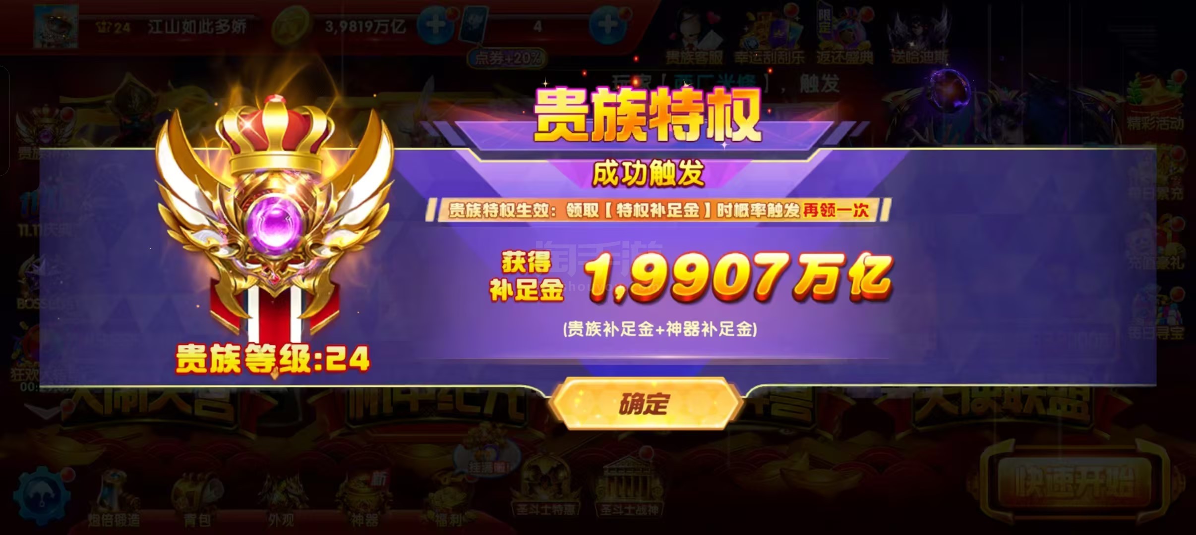 安卓oppo-贵族24,加成1595% 14套,双神卫觉醒,天使惩击,救济金1.99京翻倍就是4京