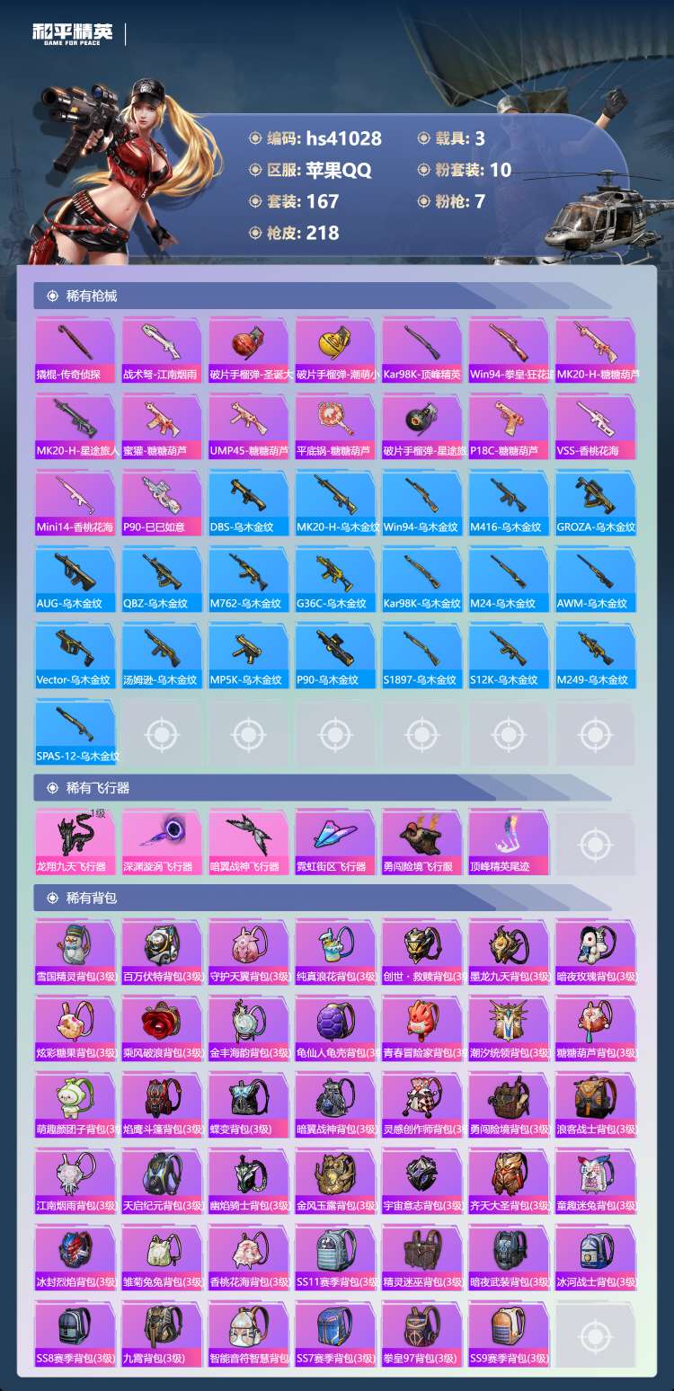 hs41028 苹果手Q-16王牌印记-1红装-10粉装-7特效枪-3载具-79489热力值-167
