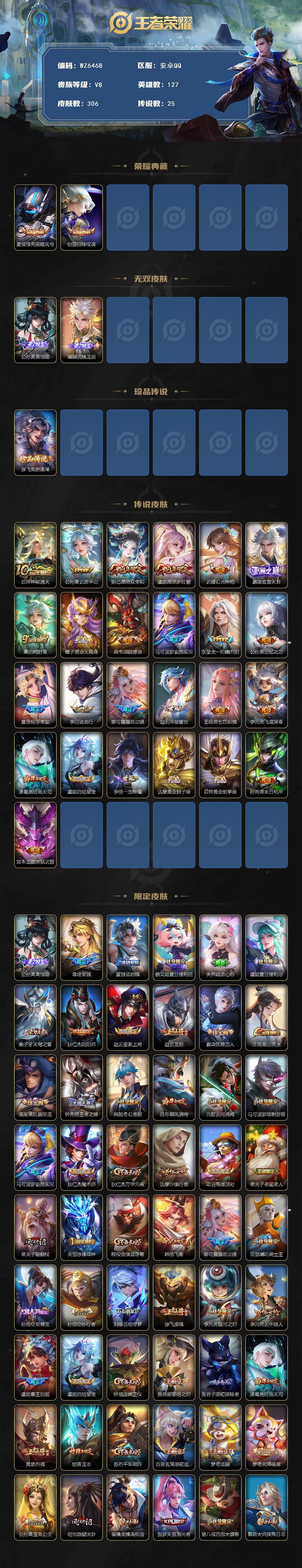 安卓Q-V8-最强王者段位-127英雄-306皮肤-2典藏-0珍品无双-2无双