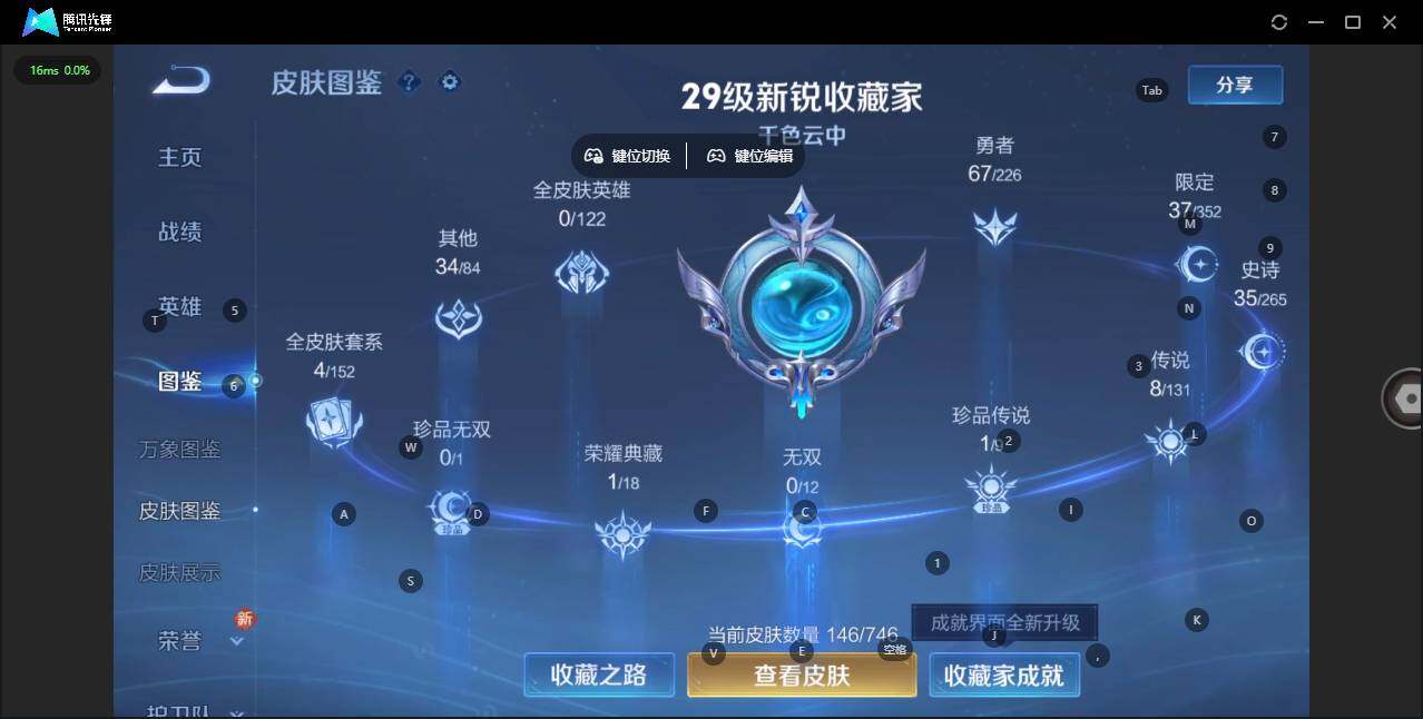 贵族等级: V7 英雄数: 120 皮肤数: 146 荣耀水晶: 天鹅之梦 珍