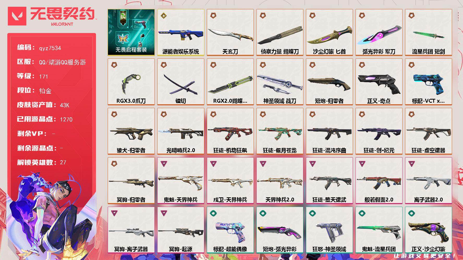 【qyz7534】精品账号急出可捡漏 qyz7534 近战武器皮肤: 军刀-弧光异彩,蝴蝶刀-侦察力量,天玄刀,匕首-沙尘幻旅,爪刀-RGX 11z Pro 3.0,短剑-流星兵团,镭切,神圣领域 战刀,RGX 11z Pro//2.0 蝴蝶刀 步枪皮肤: 狂徒-偃月苍龙,獠犬-归零者,戍卫-天界神兵,幻影-光明哨兵2.0,狂徒-机动狂飙,狂徒-堕天遗武,幻影-天界神兵2.0,幻影-源能者娱乐系统,狂徒-混沌序曲,狂徒-般若假面//2.0,狂徒-创·纪元,狂徒-虚空遗器,狂徒-离子武器2.0 佩