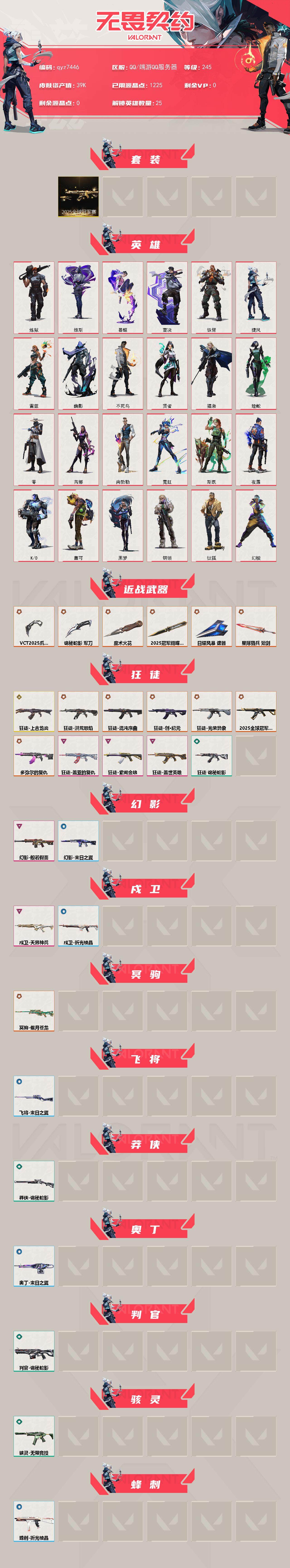 【qyz7446】25套装 25爪全是单卖 精品 qyz7446 套装: VCT 2025赛季礼包 近战武器皮肤: VCT 2025 爪刀,诡秘蛇影,魔术火花,2025全球冠军赛 蝴蝶刀 步枪皮肤: 狂徒-紫阙金琅,狂徒-盖亚的复仇,戍卫-天界神兵,狂徒-盖世英雄,狂徒-洪荒怒焰,幻影-般若假面,狂徒-混沌序曲,狂徒-上古龙炎,狂徒-创·纪元,狂徒-光荣异象,2025全球冠军赛 狂徒 佩枪皮肤: 标配-紫阙金琅,狂怒-起源,正义-塑水宗,正义-千灵华绽,标配-VCT25xEDG 狙击枪皮肤: 冥