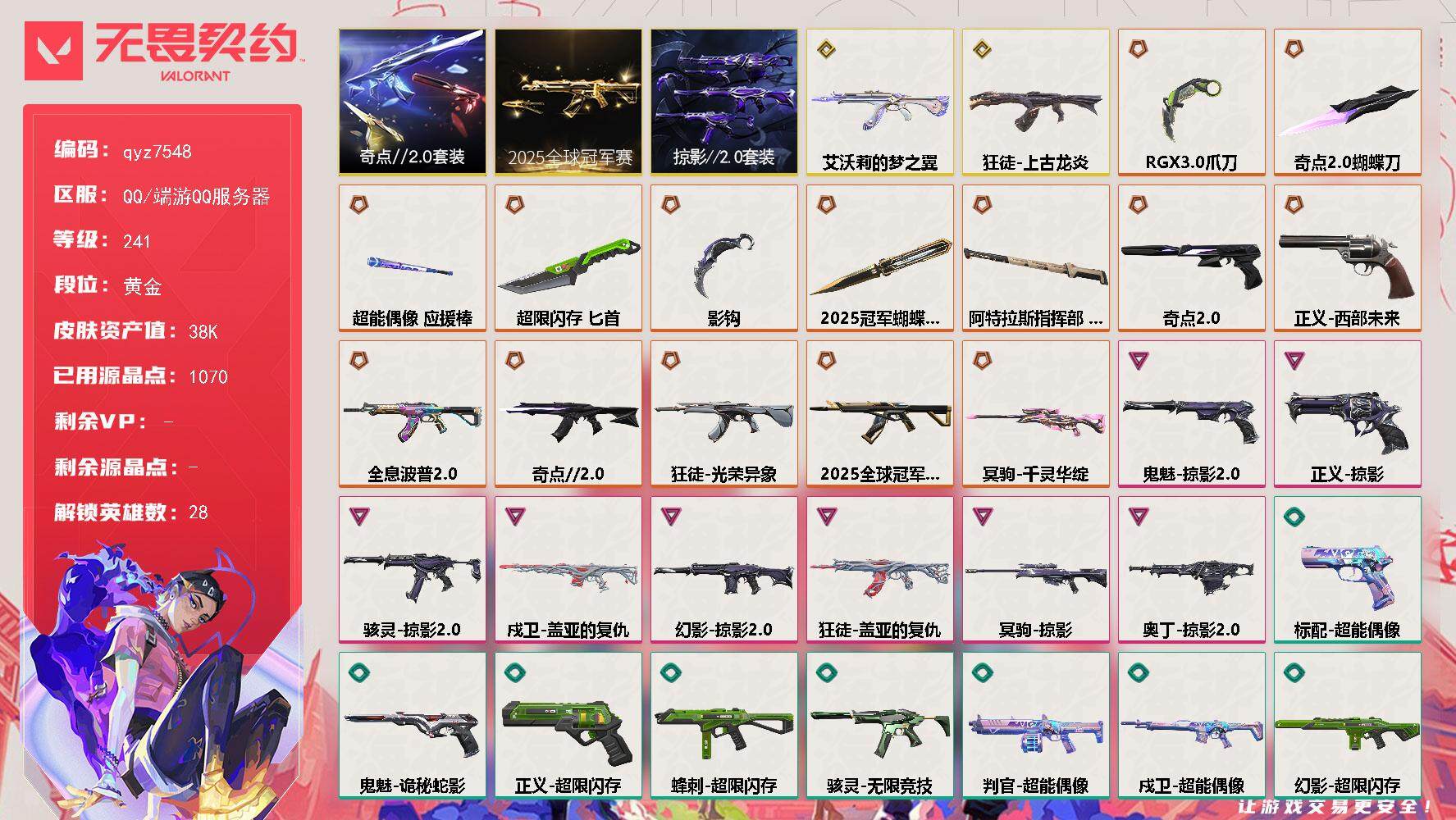 【qyz7548】猫猫AK 25冠军套 掠影//2.0套 千灵华绽 冥驹 qyz7548 套装: 奇点//2.0套装,掠影2.0套装 近战武器皮肤: 超能偶像 应援棒,爪刀-RGX 11z Pro 3.0,匕首-超限闪存,蝴蝶刀-奇点//2.0,影钩,2025全球冠军赛 蝴蝶刀 步枪皮肤: 戍卫-盖亚的复仇,狂徒-盖亚的复仇,狂徒-艾沃莉的梦之翼,狂徒-全息波普//2.0,狂徒-奇点//2.0,狂徒-上古龙炎,狂徒-光荣异象,幻影-掠影2.0,2025全球冠军赛 狂徒 佩枪皮肤: 鬼魅-奇点//