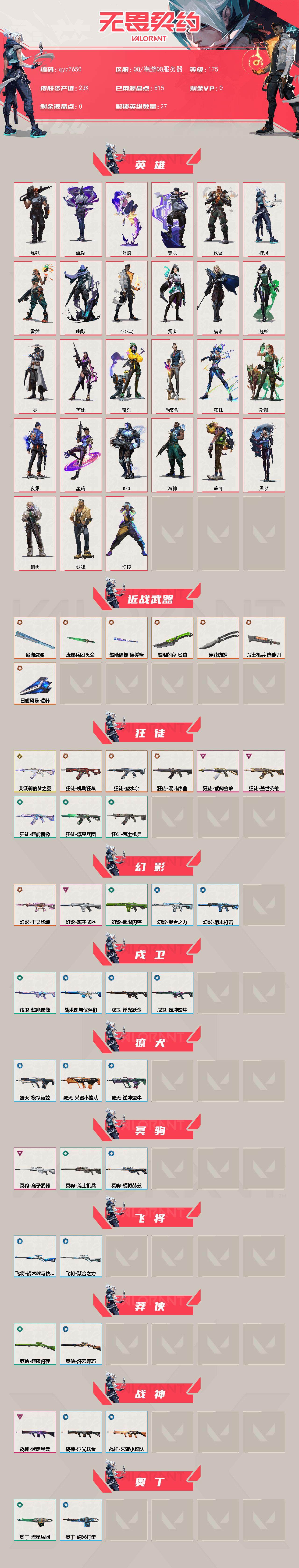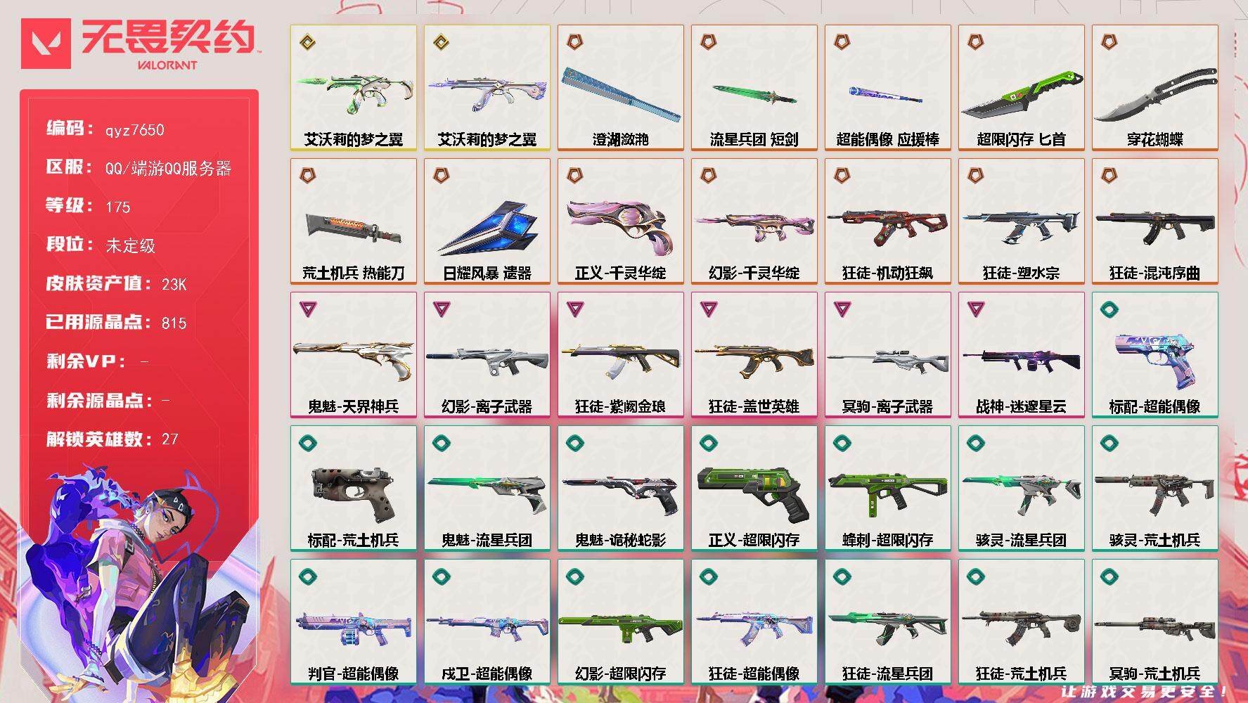 猫猫 塑水ak 千灵m4 qyz7650 Lv175|未定级, 刀皮数量7,枪皮数量75(绝版0限定12终极2卓越6);皮肤资产价值23730,已用R点815;【刀皮】:近战武器-闪耀之星荧光棒,近战武器-超限闪存匕首,近战武器-澄湖潋滟,近战武器-流星兵团短剑,近战武器-荒土机兵热能刀,近战武器-穿花蝴蝶,近战武器-日耀风暴遗器; 【枪皮】:正义-千灵华绽,狂徒-塑水宗,狂徒-机动狂飙,狂徒-混沌序曲,幻影-千灵华绽,骇灵-艾沃莉的梦之翼,狂徒-艾沃莉的梦之翼,鬼魅-天界神兵,狂徒-紫阙金琅,