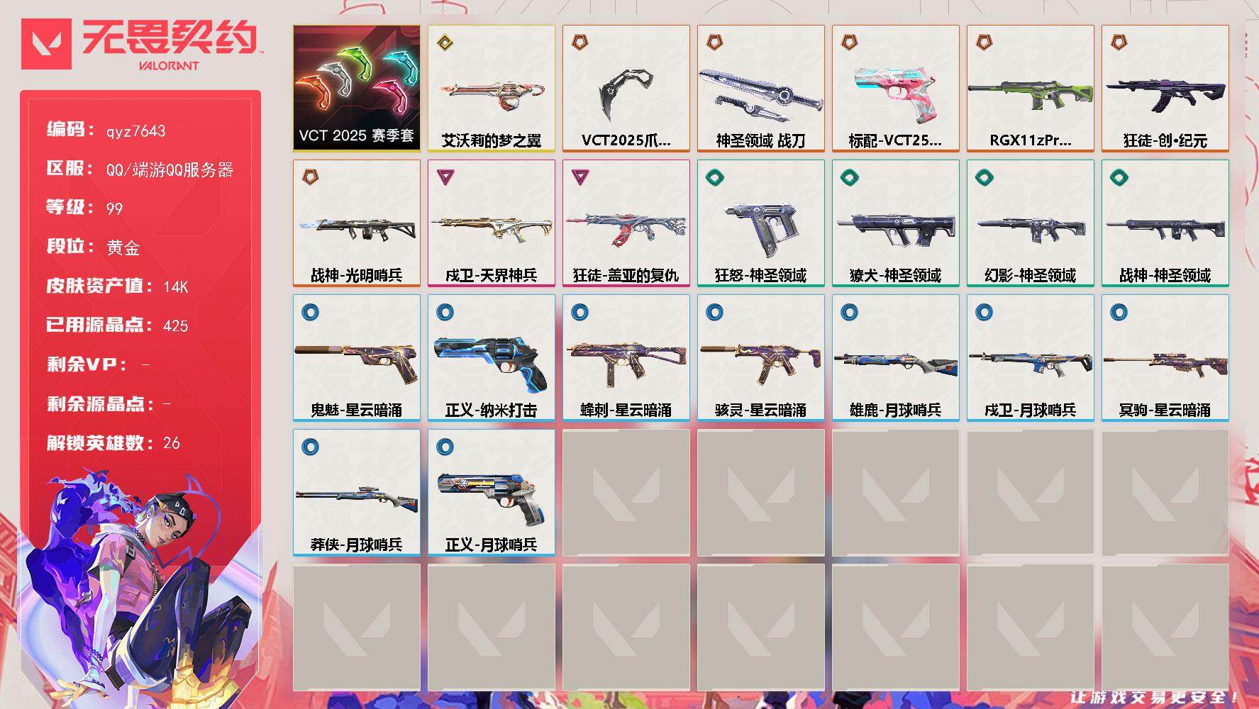 vct25爪+vct标配+创纪元盖亚ak精品黄金小号 qyz7643 Lv99|黄金I, 刀皮数量2,枪皮数量21(限定6终极1卓越2);皮肤资产价值14610,已用R点425;【刀皮】:近战武器-VCT2025爪刀,近战武器-神圣领域战刀; 【枪皮】:标配-VCT25xBLG,狂徒-创纪元,幻影-RGX11zPro2.0,战神-光明哨兵,奥丁-艾沃莉的梦之翼,狂徒-盖亚的复仇,戍卫-天界神兵,幻影-神圣领域,獠犬-神圣领域,鬼魅-幻心猎手,狂怒-神圣领域,战神-神圣领域,戍卫-月球哨兵,冥驹-