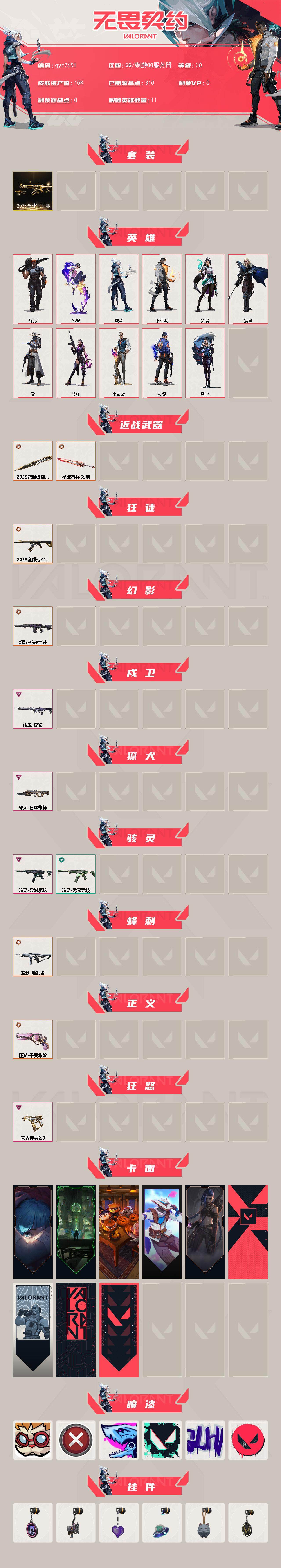 25套装 古神m4 千灵正义 qyz7651 Lv30|未定级, 刀皮数量2,枪皮数量21(绝版2限定6终极0卓越4);皮肤资产价值15600,已用R点310;【刀皮】:近战武器-2025全球冠军赛蝴蝶刀,近战武器-星际猎兵短剑; 【枪皮】:狂徒-2025全球冠军赛,正义-千灵华绽,蜂刺-噬影者,幻影-黯夜怪谈,狂怒-天界神兵2.0,骇灵-异鳞魔蛇,戍卫-掠影,獠犬-日冕雄师,标配-星际猎兵,骇灵-无限竞技,判官-星际猎兵,幻影-星际猎兵,飞将-星际猎兵,狂徒-瑰梦艺语,戍卫-光环序列,冥驹-光