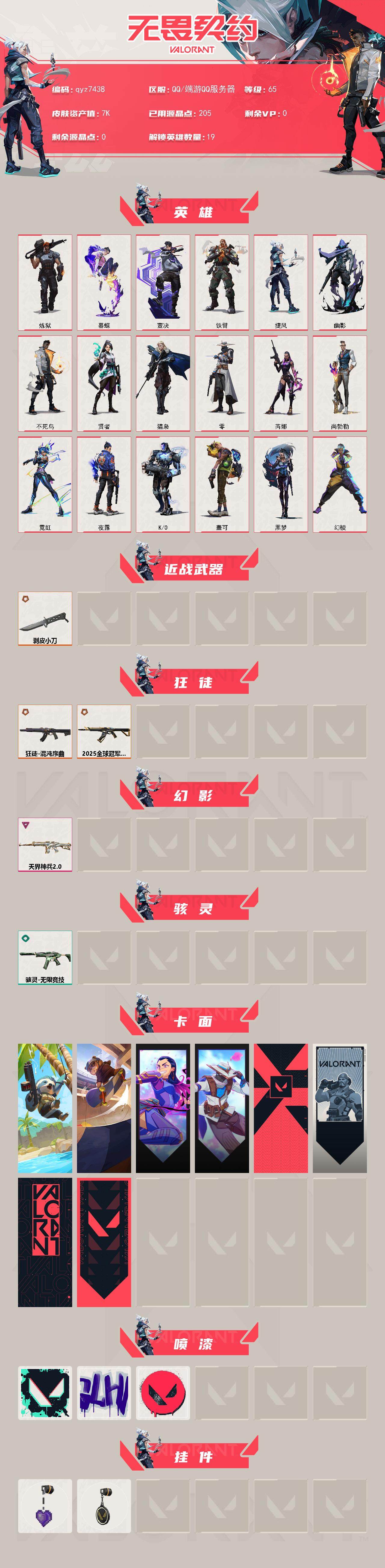 【qyz7438】混沌序曲 狂徒 剥皮小刀 2025全球冠军赛狂徒 天界神兵//2.0 幻影 qyz7438 近战武器皮肤: 剥皮小刀 步枪皮肤: 幻影-天界神兵2.0,狂徒-混沌序曲,2025全球冠军赛 狂徒 亮点: 【qyz7438】【英雄】:幻棱,炼狱,暮蝶,壹决,铁臂,捷风,幽影,不死鸟,贤者,猎枭,零,芮娜,尚勃勒,霓虹,夜露,K/O,盖可,黑梦【近战 武器】:近战武器-剥皮小刀【狂徒】:狂徒-2025全球冠军赛,狂徒-混沌序曲【幻影】:幻影-天界神兵//2.0【骇灵】:骇灵-无限竞