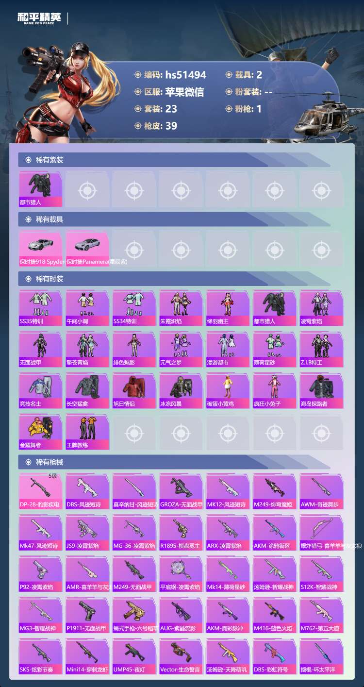 hs51494 苹果v-1王牌印记-1特效枪-2载具-12483热力值-23套装-39枪皮-1卓越