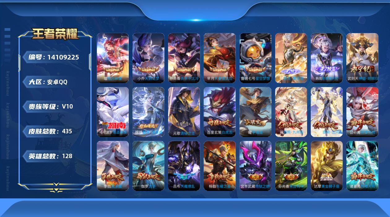 448-[14109225]安卓手Q200区435皮5典藏39传说3无双2珍品传说V10 营地ID365052728荣耀王者【珍品传说皮肤】:器灵·落星盏,怪盗基德【无双皮肤】:群星魔术团,器灵·螭龙剑,神器·明辉仪【荣耀典藏】:拾光映像,杀手不太冷,星空梦想,大秦宣太后,天鹅之梦【优质限定皮肤】:祈雪灵祝,武圣,白虎志,梅西,天魔缭乱,至尊宝,凤求凰【传说皮肤】:诡秘之主,愿照·山河定,幻光神枪,愿照·九州拓,玄雷天君,鸣野蒿,觅芳踪,淬星耀世,乞巧织情,游龙清影,李逍遥 ,音你心动,音你心动