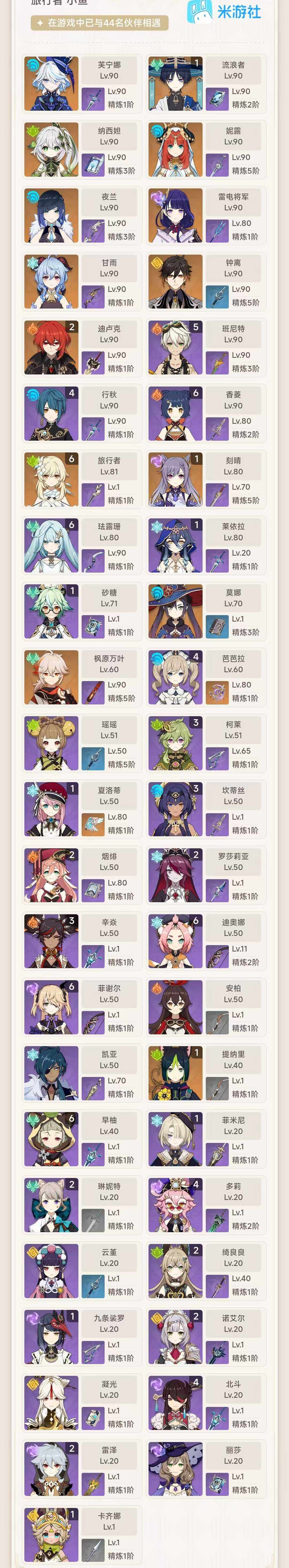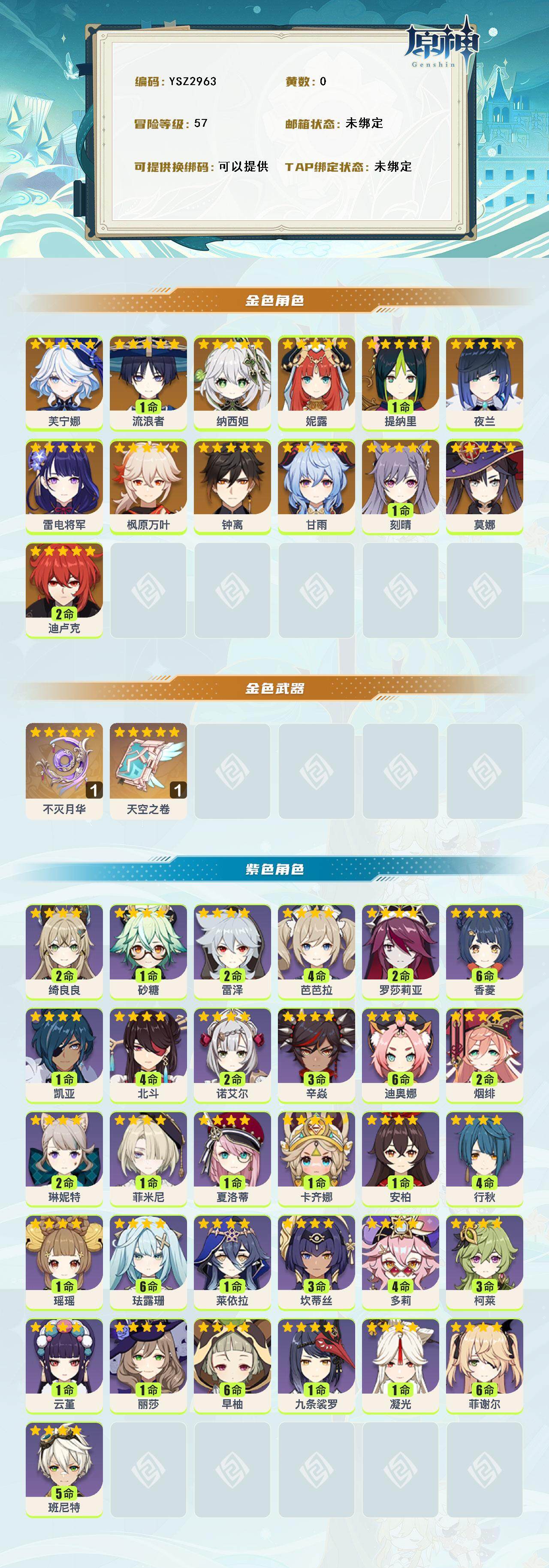 【YSZ2963】57级/女主/14个五星角色/芙宁娜/1命流浪者/纳西妲/妮露/1命提纳里/夜兰/雷电将军/枫原万叶/甘雨/钟离/1命刻晴/2命迪卢克/莫娜/不灭月华/天空之卷/1命卡齐娜/1命夏洛蒂/1命菲米尼/2命琳妮特/2命绮良良/瑶瑶/满命珐露珊/1命莱依拉/3命坎蒂丝/4命多莉/3命柯莱/云堇/1命九条裟罗/满命早柚/2命烟绯/2命罗莎莉亚/3命辛焱/满命迪奥娜/1命砂糖/2命雷泽/满命菲谢尔/0命丽莎/4命北斗/满命香菱/安柏/5命班尼特/4命行秋/4命芭芭拉/0命凝光/2命诺艾尔