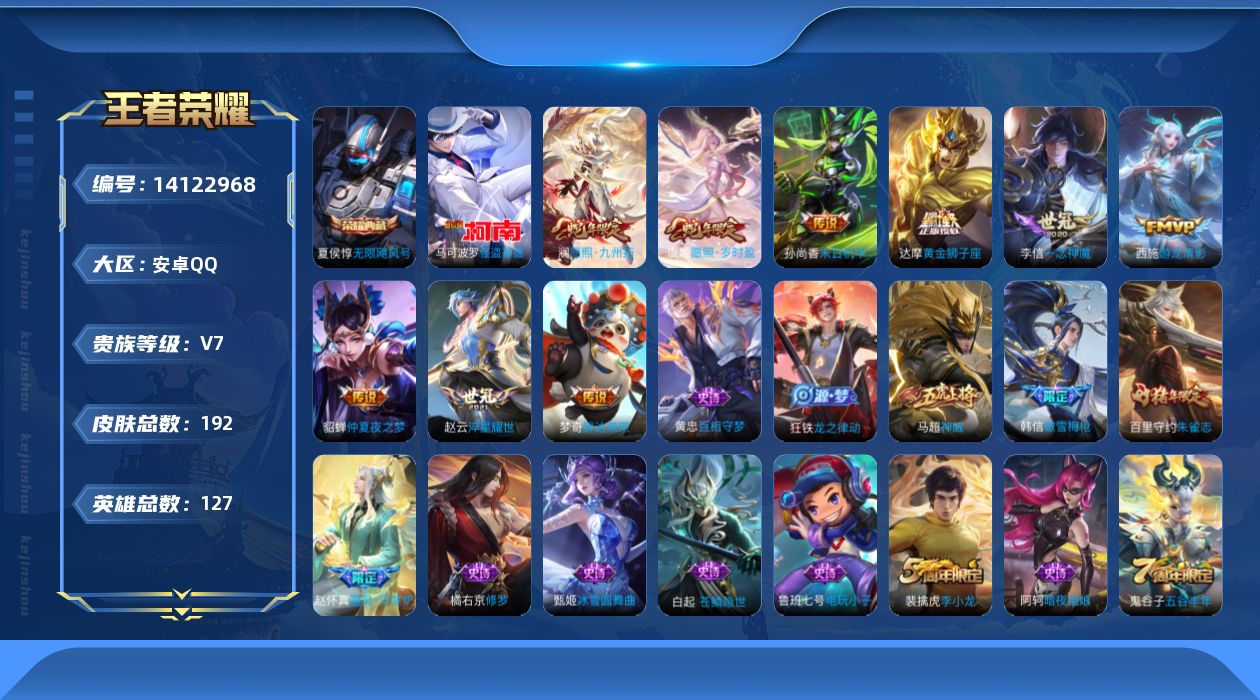 273-[14122968]贵族7-192皮1典藏9传说0无双1珍品传说 安卓手Q304区192皮1典藏9传说0无双1珍品传说V7 营地ID1837971569非凡王者【珍品传说皮肤】:怪盗基德【荣耀典藏】:无限飓风号【优质限定皮肤】:神威【传说皮肤】:黄金狮子座,胖达荣荣,愿照·岁时盈,愿照·九州拓,游龙清影,仲夏夜之梦,淬星耀世,末日机甲,一念神魔【史诗皮肤】:舞动绿茵,修罗,巫礼祀神,李小龙,龙之律动,顽趣,百相守梦,电玩小子,功夫厨神,器灵·浮梦炉,苍鳞隐世,暗夜贵公子,地狱