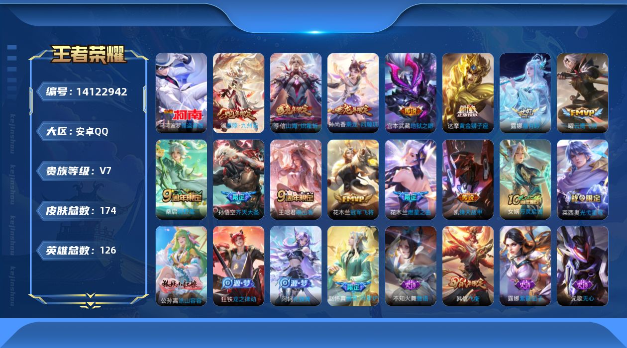 468-[14122942]贵族7-贵族积分27380-174皮0典藏14传说1珍品传说 安卓手Q25区174皮0典藏14传说0无双1珍品传说V7 营地ID476405043无双王者【珍品传说皮肤】:怪盗基德【优质限定皮肤】:山海·炽霜斩【传说皮肤】:乘龙·问璇玑,神树通天,绛天战甲,齐天大圣,映山客,冠军飞将,地狱之眼,黄金狮子座,鸣野蒿,霜月吟,山海·炽霜斩,云鹰飞将,燃星之曲,愿照·九州拓【史诗皮肤】:末日机甲,天秀·启明,天才门将,龙之律动,万灵启世,光弋星穹,未来纪元,原初追逐者