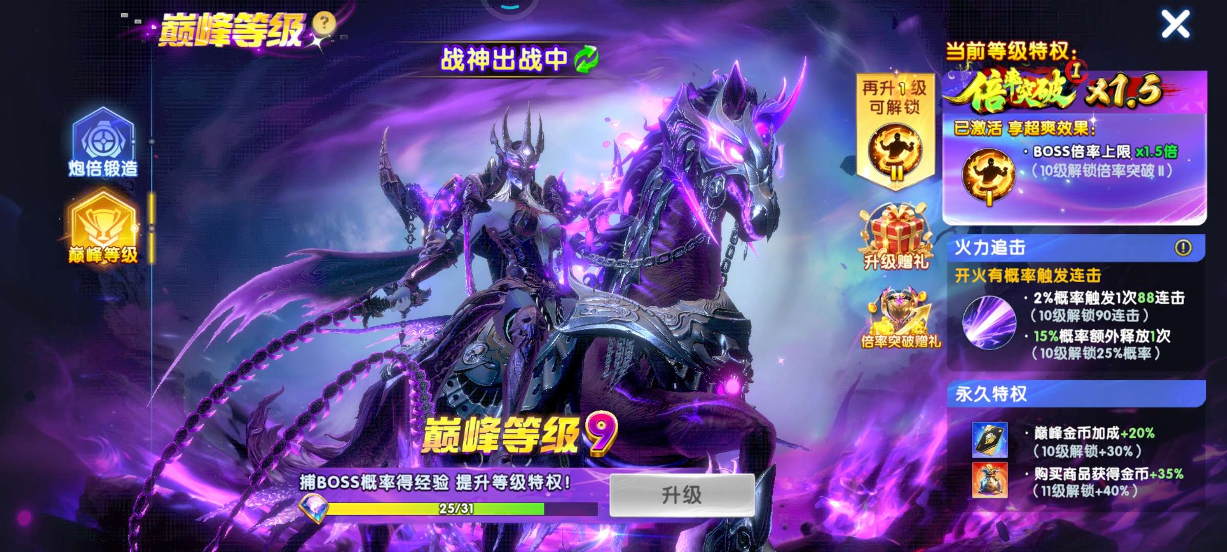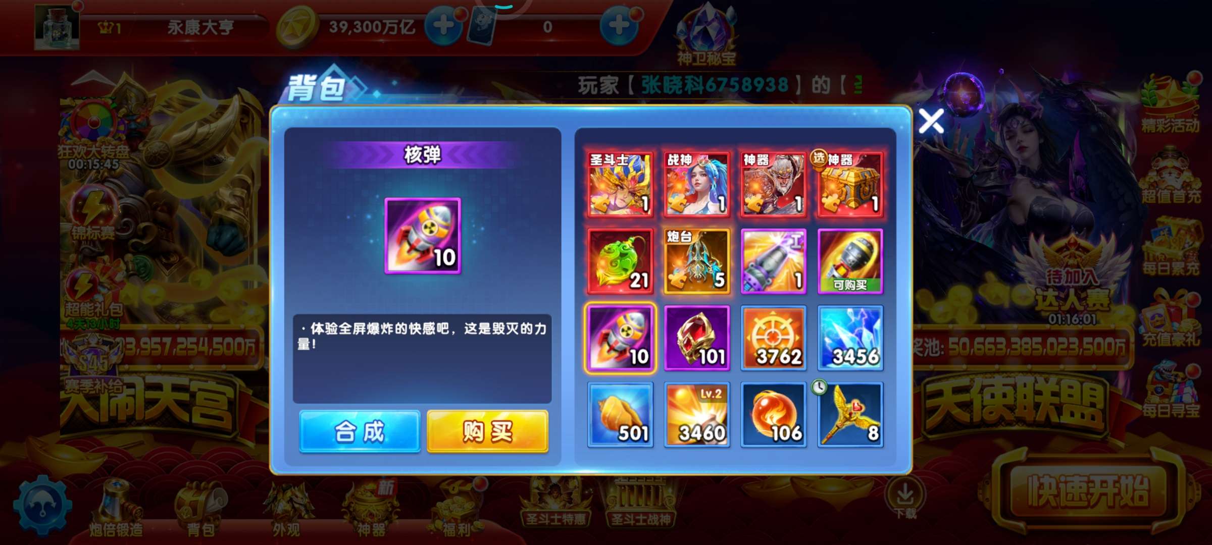 393万亿 60炮 带滋炮台 巅峰9级 加速翅膀6天 二级狂2天 狂暴3460 核弹10